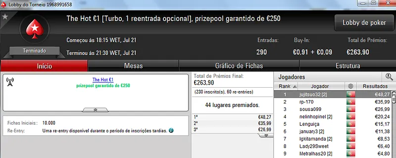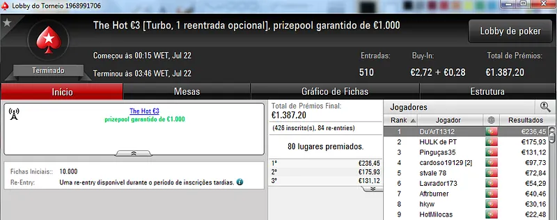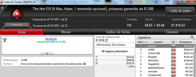 Já o The Hot BigStack Turbo €50 teve a participação de 76 jogadores que realizaram 13 reentradas. O acordo a três permitiu a S3kalhar77 receber €796 pelo primeiro posto. O maior prémio ficou com TiJoao que levou €815 na segunda posição. A completar o pódio, famaguda01 faturou €666 que juntou aos €210 ganhos pelo quinto lugar no The Big €100.