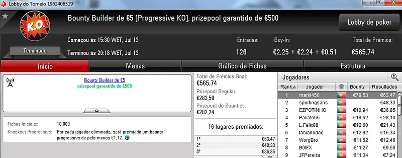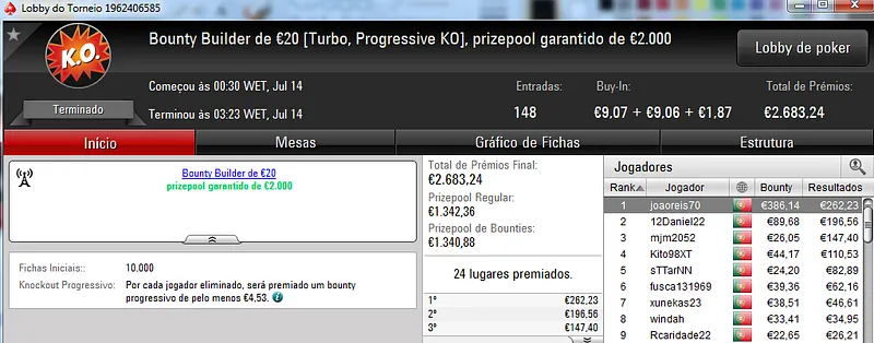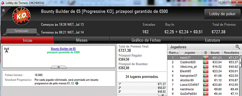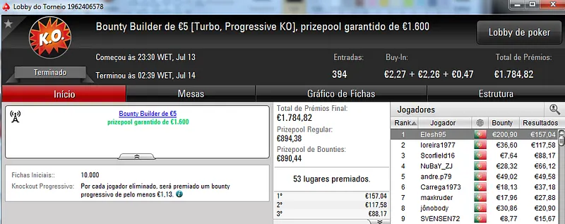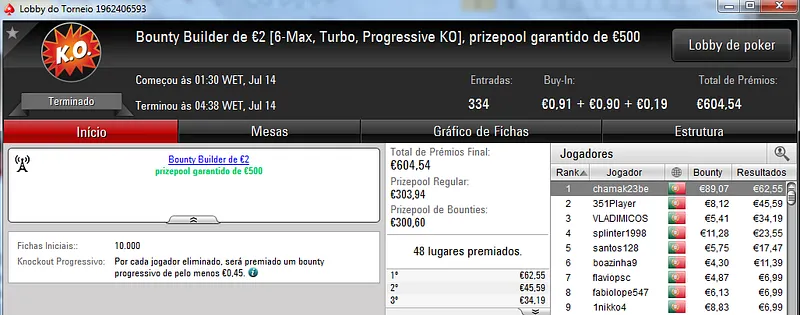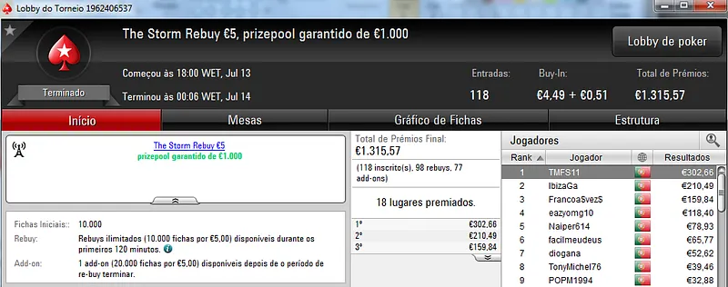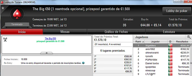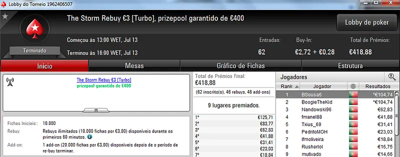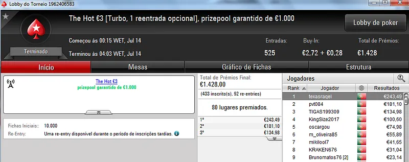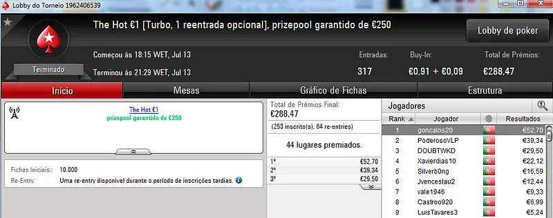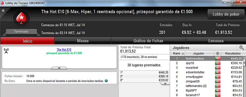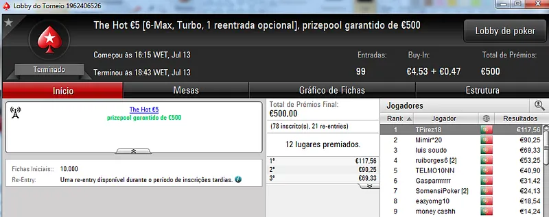 O The Hot BigStack Turbo €50 contou com 115 entradas que perfizeram o prize pool de €5,212. Como já é normal os prémios foram distribuídos pelos 18 melhores jogadores onde os 3 primeiros decidiram repartir os prémios depois de chegarem a acordo. Assim, no primeiro lugar erdnaandre recebeu €1,049, Wgakiterslevou €864 no segundo lugar e BP1nt0 arrecadou €1,031 na terceira posição.
