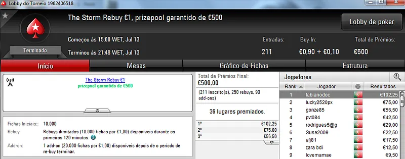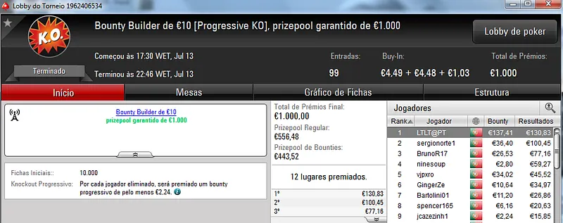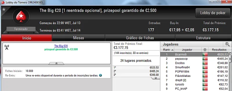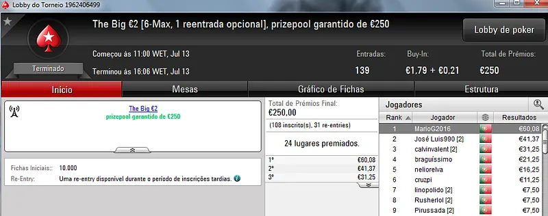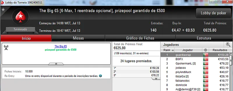 O maior desses resultados foi distribuído no The Big €100, onde participaram 31 jogadores que realizaram 4 reentradas. O prize pool chegou aos €3,172 e foi repartido pelos 6 melhores jogadores. O campeão amlfaria recebeu €1,173 depois de vencer shinekorakki no heads-up (€793). O terceiro lugar do pódio ficou para DidiTerrivel que levou para a sua conta €475.