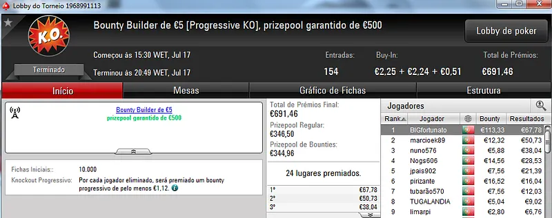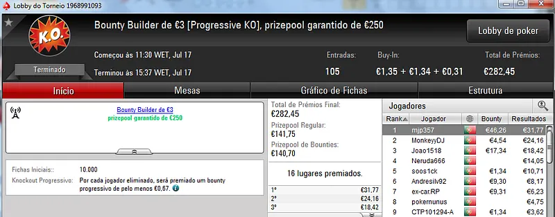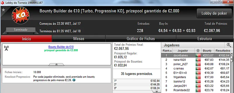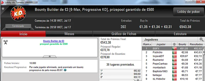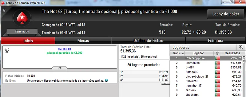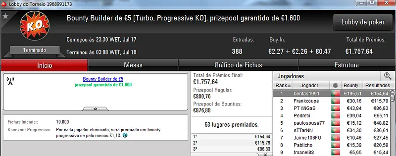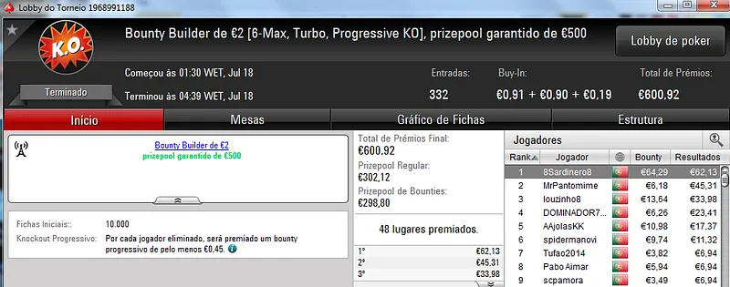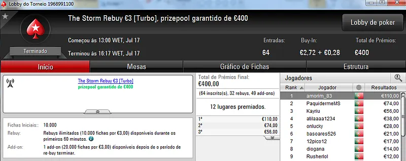 O Sunday Storm €10 também teve uma grande participação e no total acolheu 954 entradas que fizeram o prize pool chegar aos €8,557. Com o primeiro lugar ficou B0IFX que recebeu €1,346 depois de vencer shutkow no heads-up (€992). No terceiro posto do pódio ficou katy bruno que amealhou €732 neste torneio.