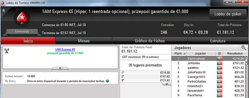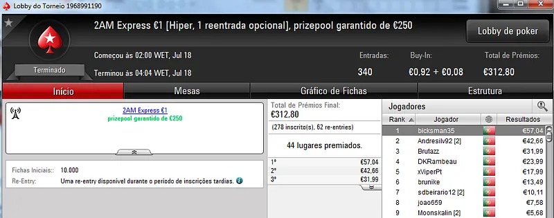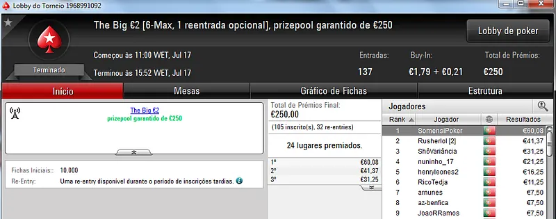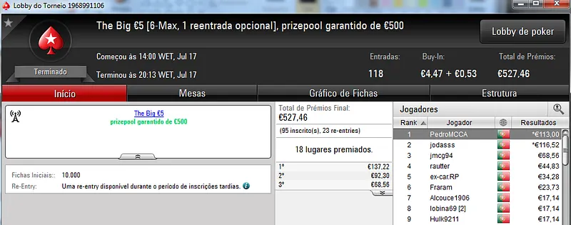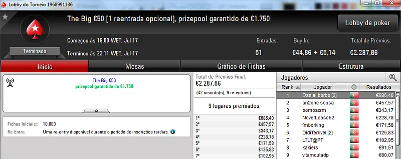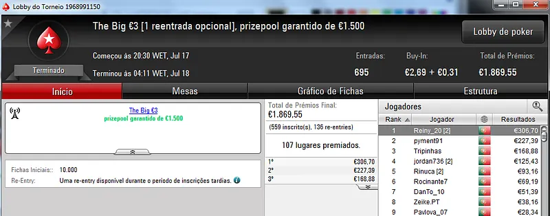 Passando para os torneios regulares diários da PokerStars.pt, o The Big Stack Turbo €50 voltou a entregar um prémio de 4 dígitos. LTLT@PT foi o contemplado ao terminar o torneio no primeiro posto para receber €1,249. Na segunda posição, pat0n1 arrecadou €840, enquanto Vacane levou €624 pelo terceiro posto para juntar aos €189 ganhos pelo sexto lugar no The Big €100.