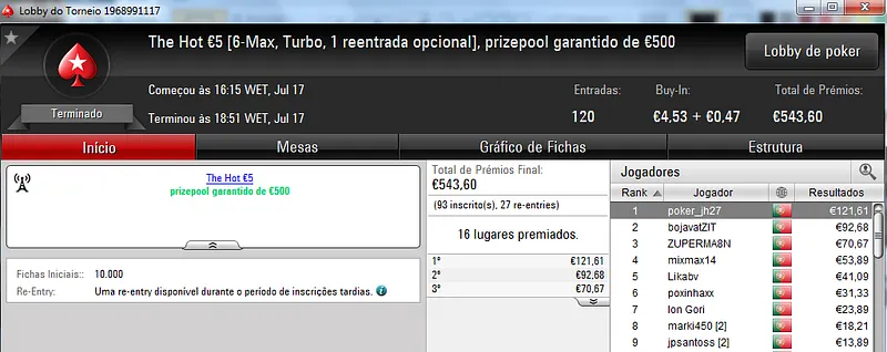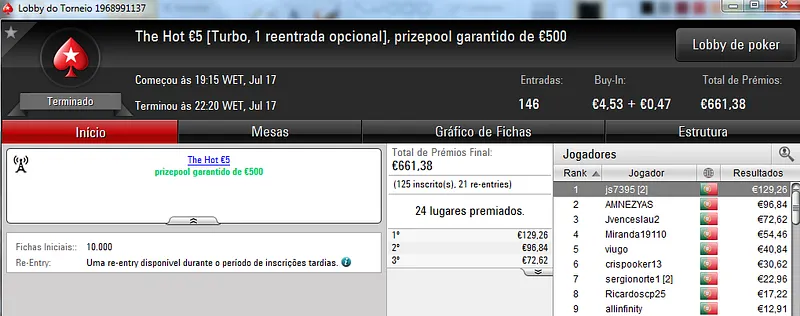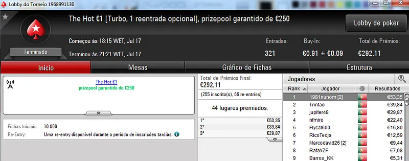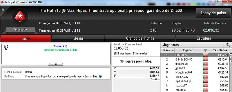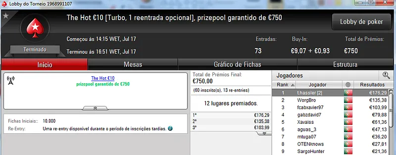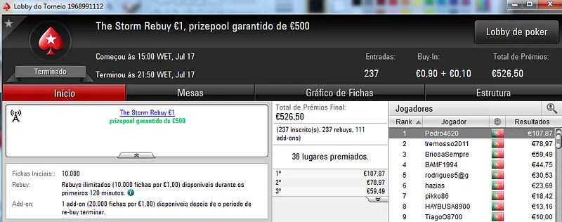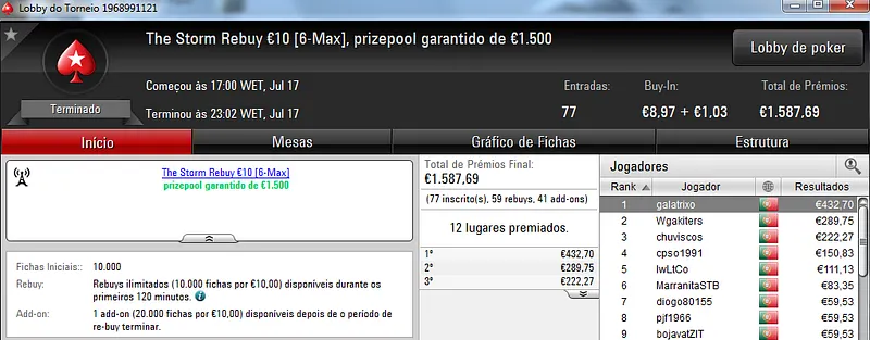 Destaque ainda para galatrixo que terminou na quarta posição, recebeu €408 e juntou este prémio às vitórias nos The Storm Rebuy €10 (€432) e The Storm Rebuy €5 (€336). No total, galatrixo somou ontem €1,176 nestes três torneios.