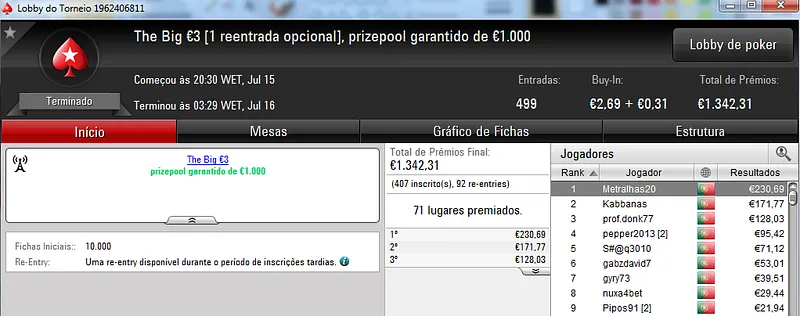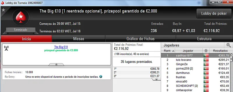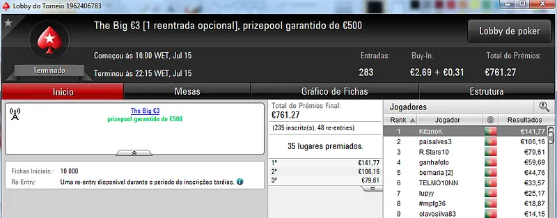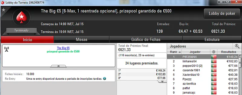 O The Big €100 teve 22 entradas que não superaram o prize pool garantido de €2,000. Os prémios foram distribuídos pelos 6 melhores classificados, onde no topo da classificação, NãoTeAtrevas levou a maior fatia, €740. O segundo lugar ficou a cargo de erdnaandre que recebeu €500 e acrescentou aos €204 conquistados pelo terceiro lugar no The Storm Rebuy €10. O pódio fica completo com joypoker125 que faturou €300 no terceiro lugar.