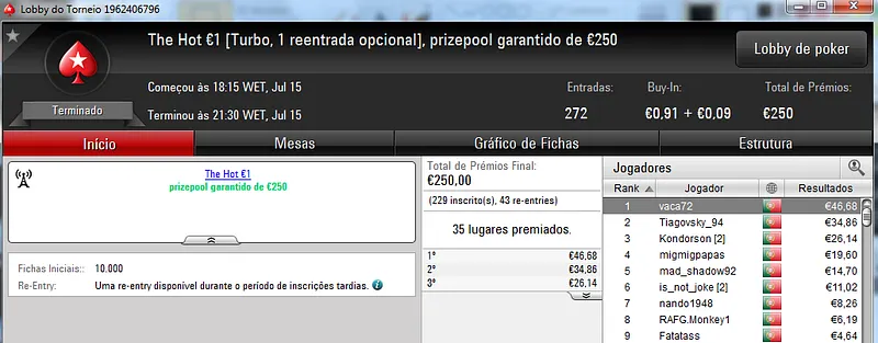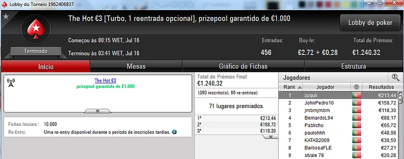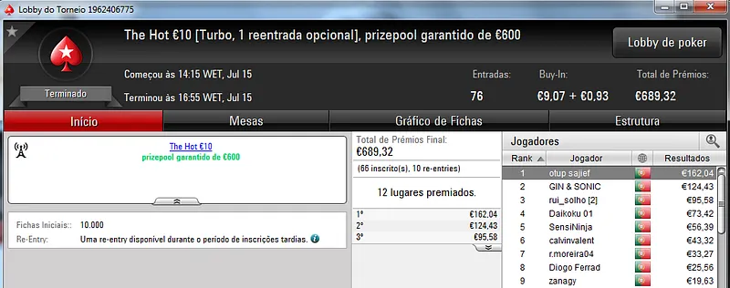 O maior prémio num só torneio acabou por ser entregue no já habitual The Hot BigStack Turbo €50. O torneio contou com 67 entradas que perfizeram um prize pool acumulado de €3,037. Com o título de campeão e €827 de prémio saiu xaneta7 depois de vencer TELMO10NN no heads-up. Apesar de ter recebido €554 de prémio de consolação neste torneio, TELMO10NN ainda acrescentou mais €564 depois de vencer o the Big €50 com 34 entradas, perfazendo um total de €1,118. Na terceira posição do pódio terminou ajjboss que levou para casa €425 de prémio.