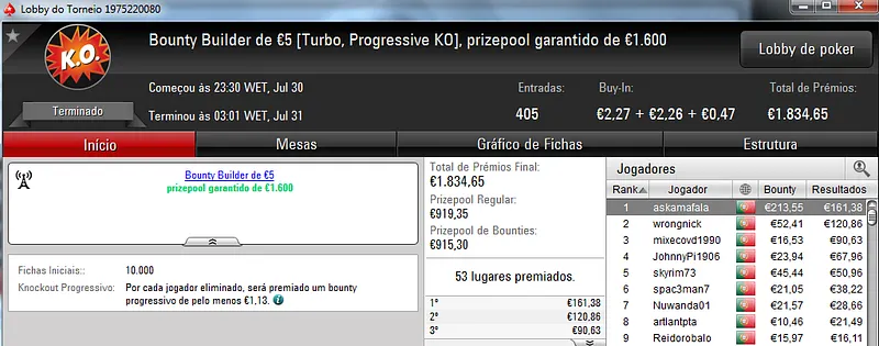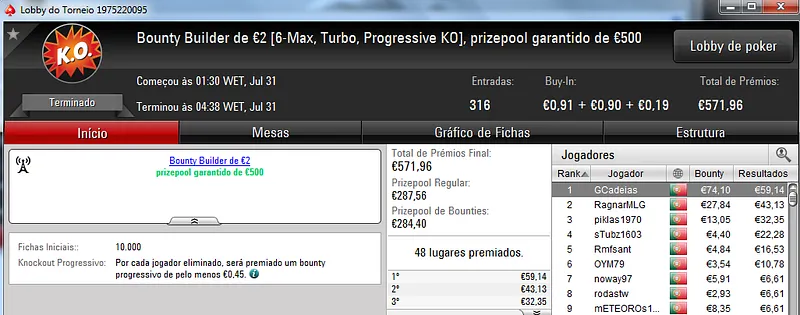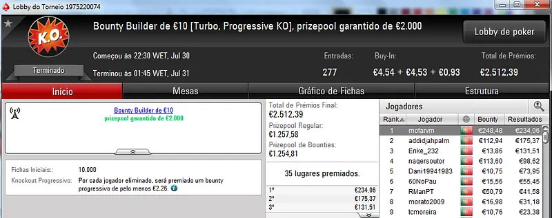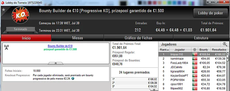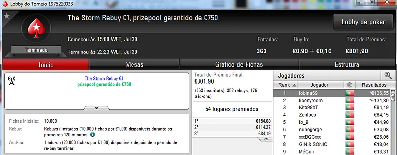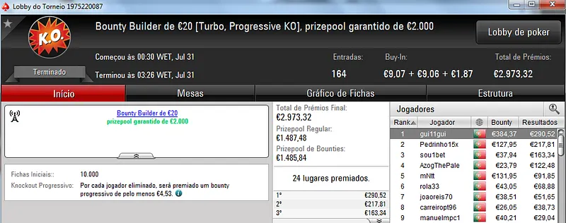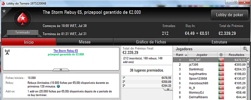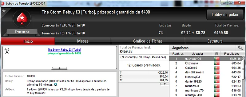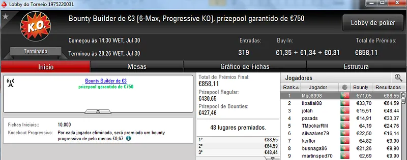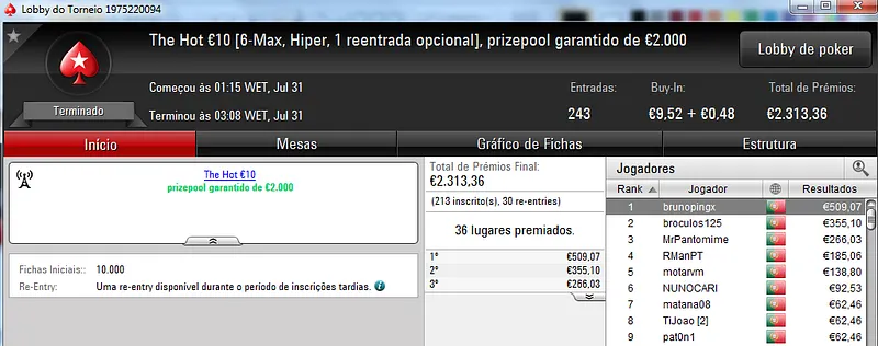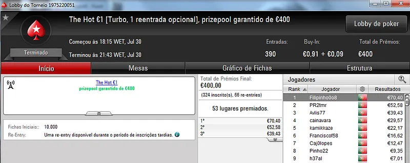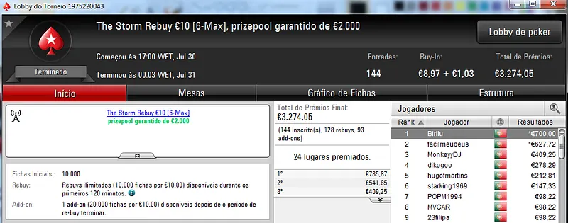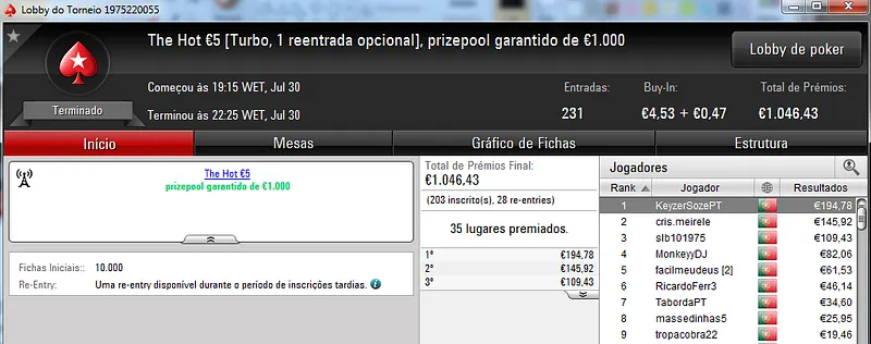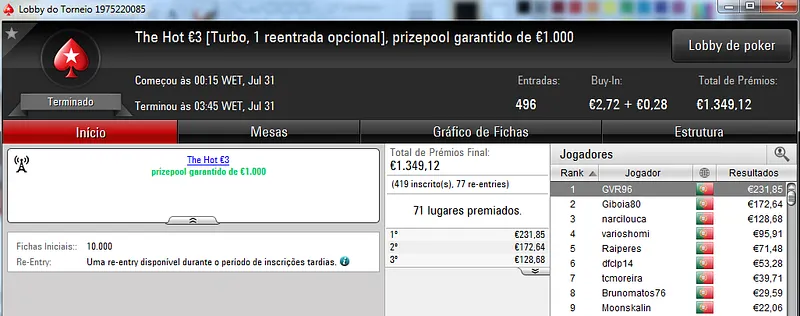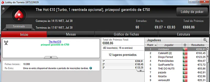 O maior prémio foi parar às mãos de xaviterra que foi o campeão do Hot BigStack Turbo €50 com 142 jogadores e €6,436 de prize pool. O campeão arrecadou €1,544 de prémio e viu maggybum na segunda posição levar para casa €1,065. O pódio fica completo com poaxer que recebeu €804.