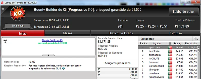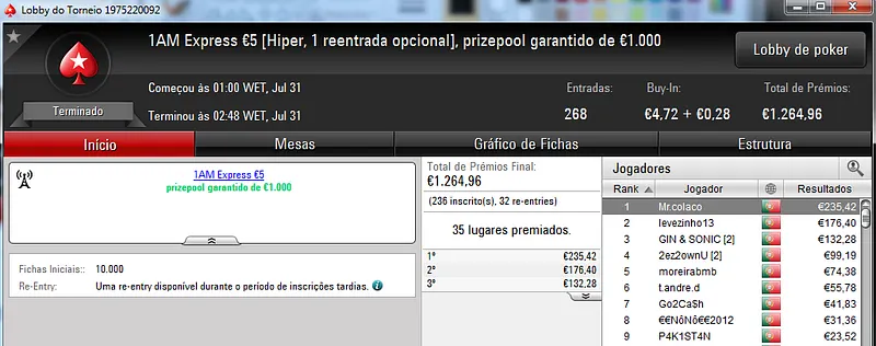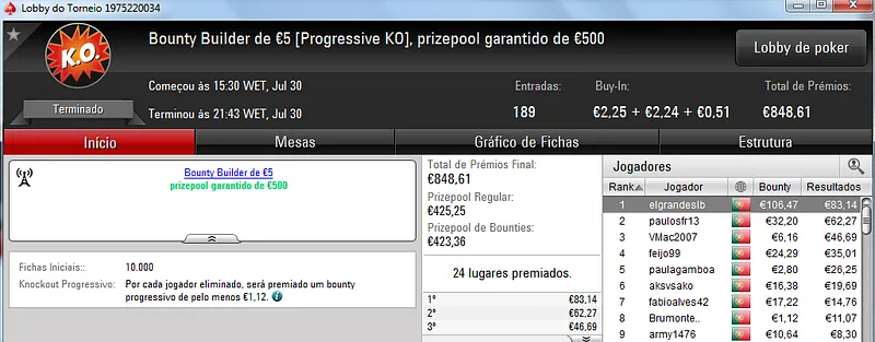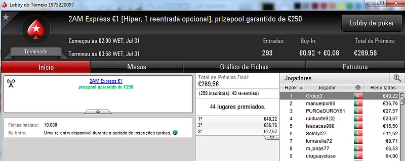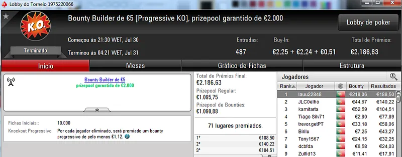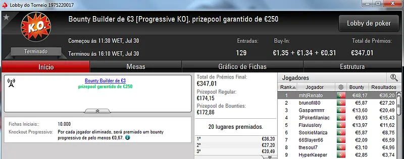 A PokerStars.pt voltou a encher-se de jogadores neste domingo para mais uma sessão cheia de ação nas mesas online. Assim, o torneio regulares da sala distribuíram mais 5 prémios de 4 dígitos.
