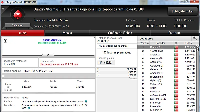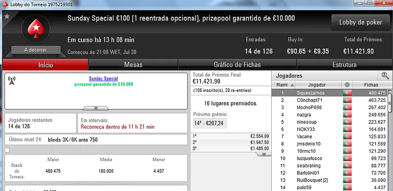 Hoje realiza-se o dia 2 do Sunday Special €100 e do Sunday Storm €10, em jogo estão mais de €19 mil.