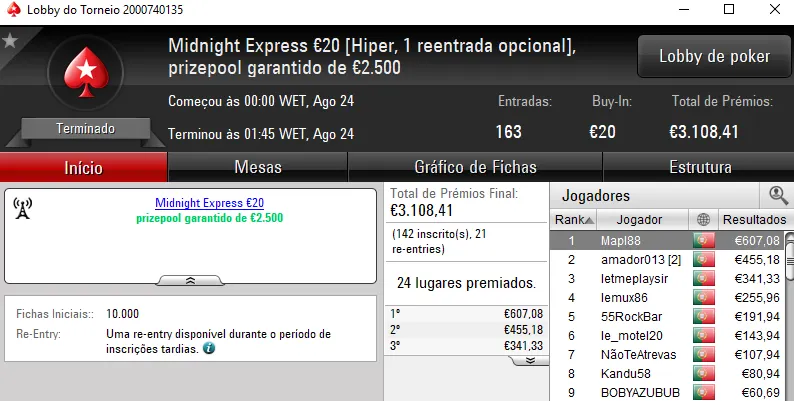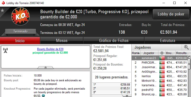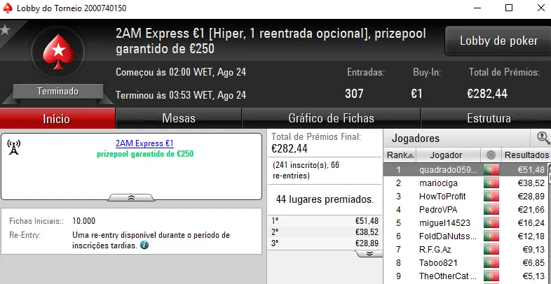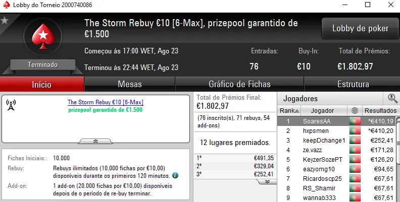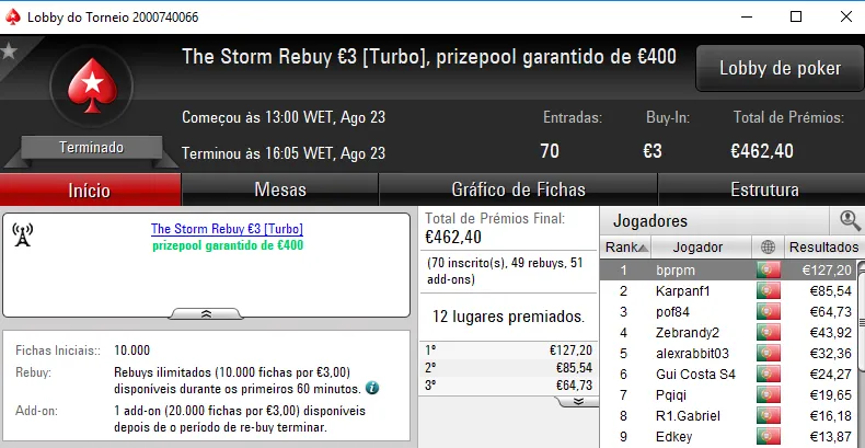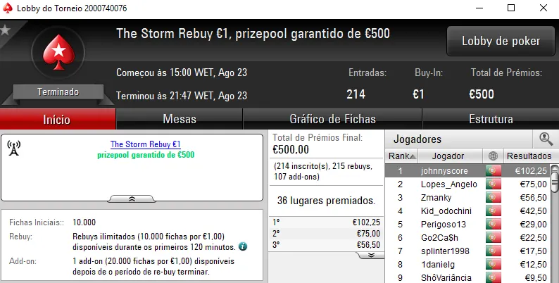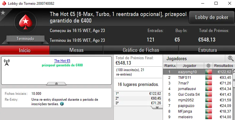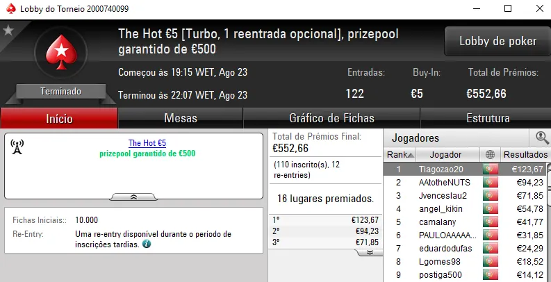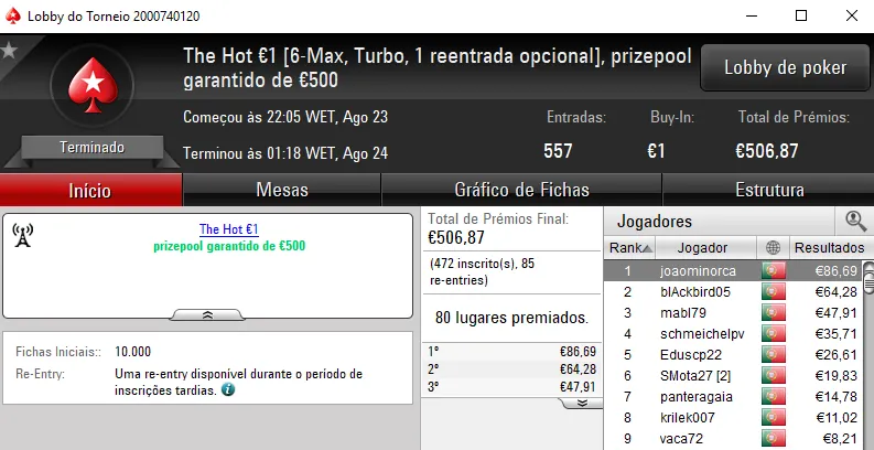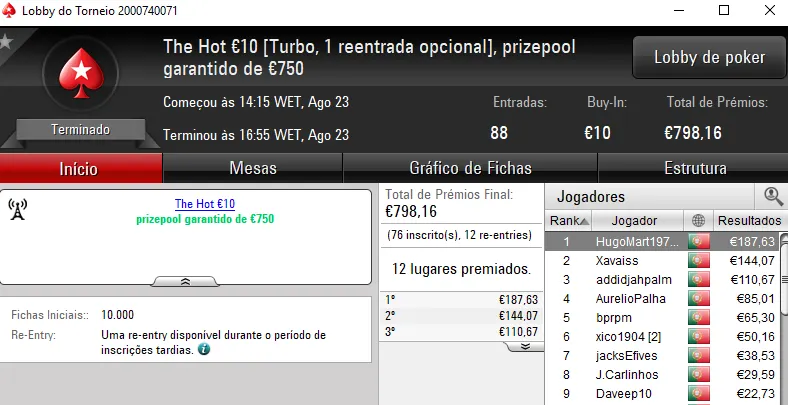 Quem mais beneficiou com isto foi askamafala que levou para casa €1,110 pelo primeiro lugar no torneio. Este não foi o único prémio de askamafala na sessão de ontem e ainda adicionou mais €181 pelo sexto lugar no The Hot BigStack Turbo €50.