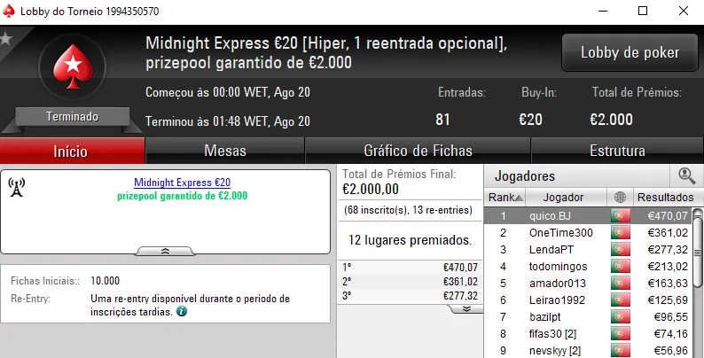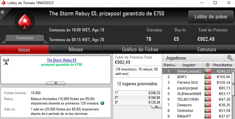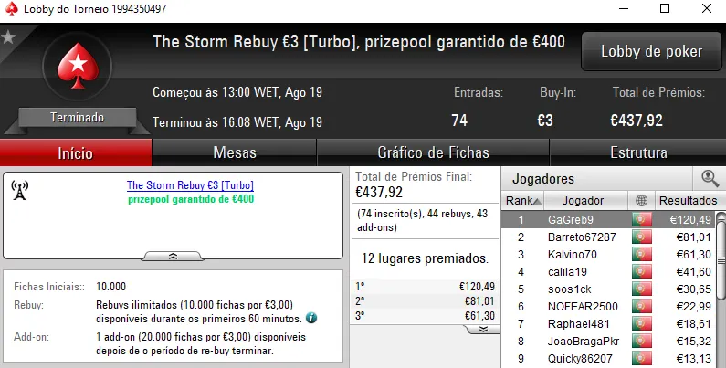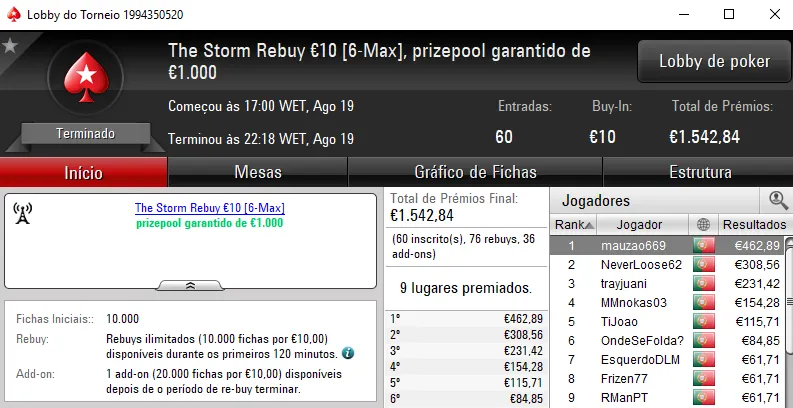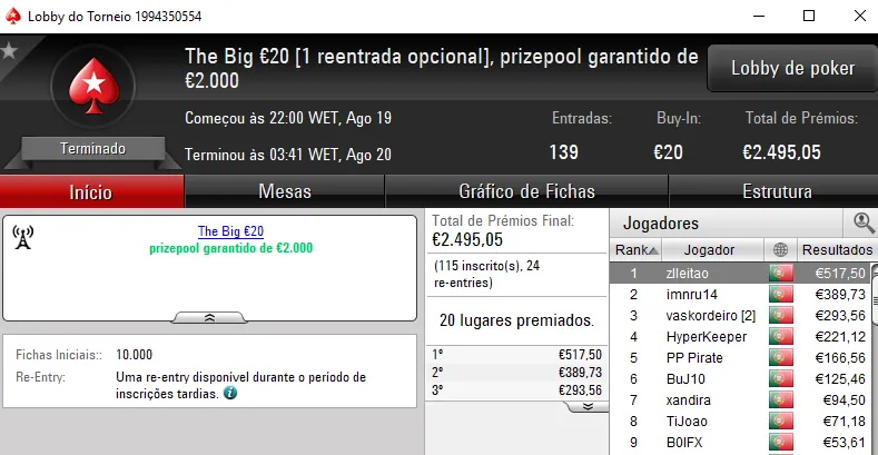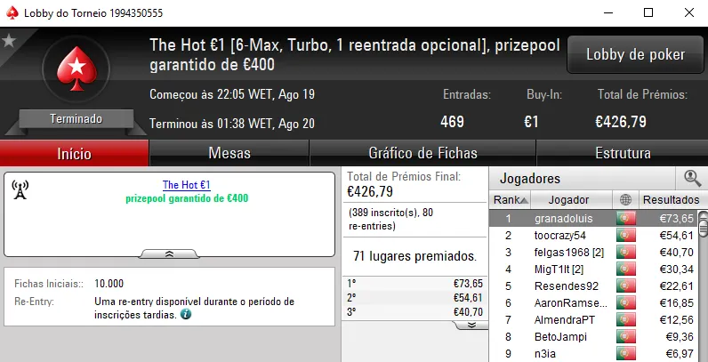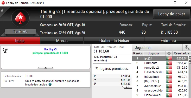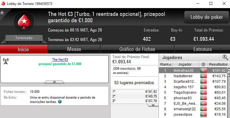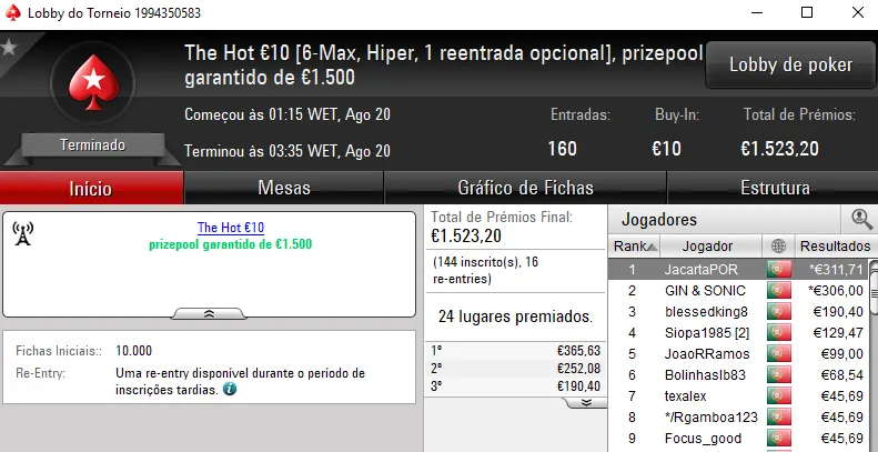 O The Hot BigStack Turbo €50 registou 57 entradas e o prize pool de €2,583 foi distribuído pelos 9 melhores classificados. FilipeLF faturou o melhor prémio e recebeu €775. Em segundo lugar, mjm2052 levou para casa €516. A fechar o pódio, Fellini33 arrecadou €387.