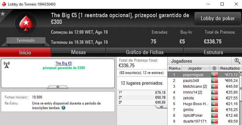 A vitória no The Big €100 já não é novidade para KeyzerSozePT, novidade talvez seja o facto de não ter recebido uma quantia acima do milhar. O torneio teve a participação de 23 jogadores que realizaram 5 reentradas. Pelo primeiro lugar, KeyserSozePT recebeu €939 dos €2,538 de prize pool acumulados. PT Rainmaker terminou no segundo posto e arrecadou €634, enquanto lousadajorge arrecadou €380 na terceira posição.