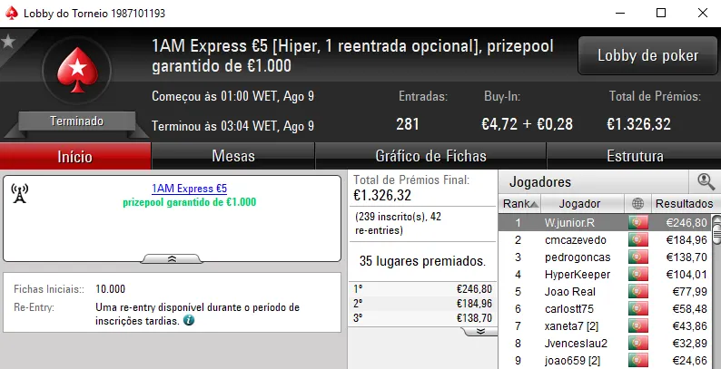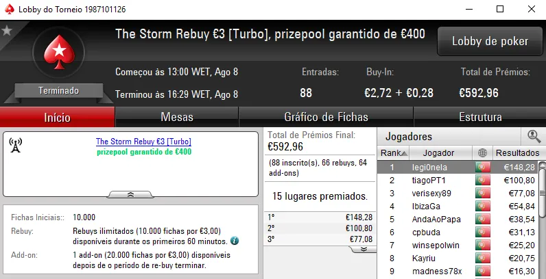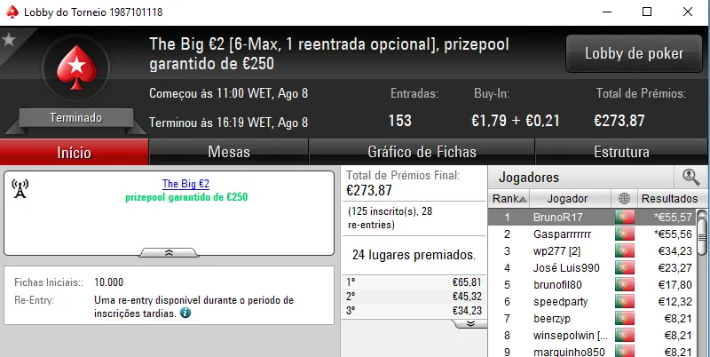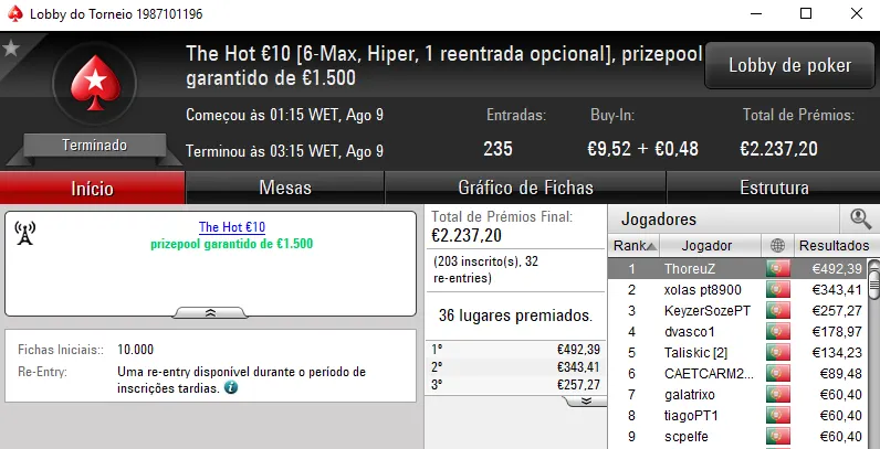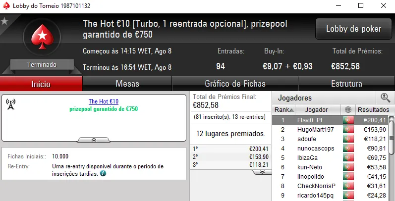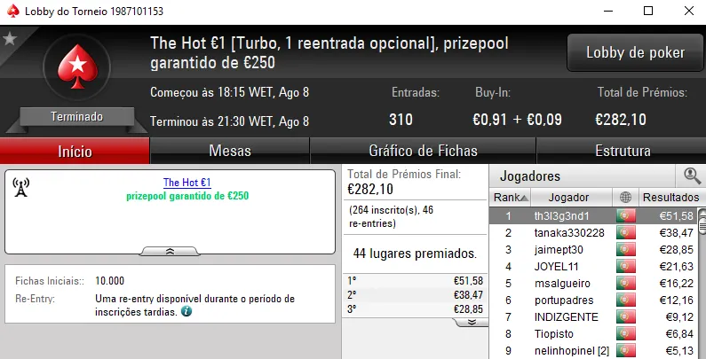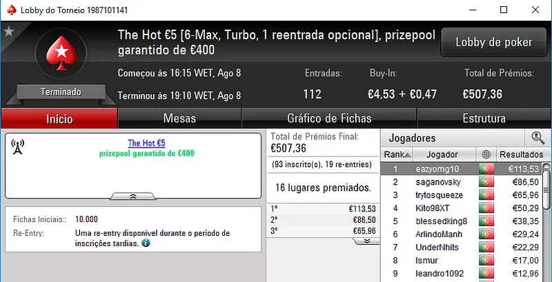 Continuando no The Hot BigStack Turbo €50, o torneio contou com 118 entradas e viu Sr_motim arrecadar €1,390 pelo primeiro lugar. Na segunda posição, todomingos levou para casa €936, enquanto fdy6 no terceiro posto arrecadou €695.