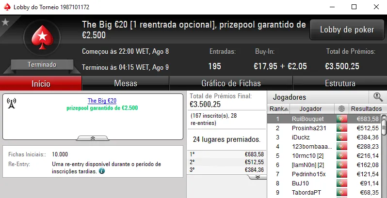 KeyzerSozePT faturou €600 na terceira posição e ainda somou mais €955 e €396 pelas vitórias no Super Tuesday Big €10 e Bounty Builder €5, respectivamente. A acrescentar a isto ainda foi terceiro classificado no The Hot €10 onde recebeu €257. No total, KeyzerSozePT faturou €2,208.