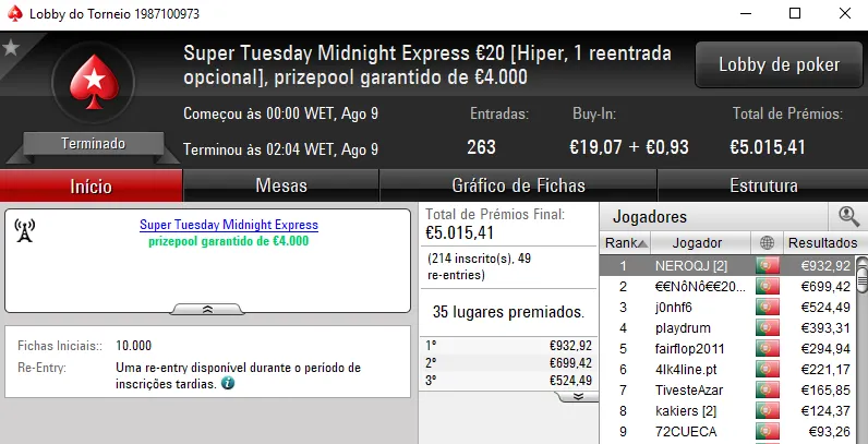 O maior prémio foi entregue no Super Tuesday €100, onde estiveram presentes 55 jogadores que realizaram 14 entradas. O prizepool garantido não foi atingido e os prémios foram repartidos pelos 12 melhores classificados. O campeão NASA114 levou para casa €1,583 depois de chegar a acordo com zenikem no heads-up que arrecadou €1,533. Na terceira posição, 10rmc10 faturou €1,039, aos quais ainda juntou €216 e €131 pelo quinto lugar no The Big €20 e no The Storm Rebuy €10, respectivamente. Mais o décimo lugar no The Hot Big Stack Turbo €50 que valeu mais €115 para perfazer uns €1,501 nestes torneios.