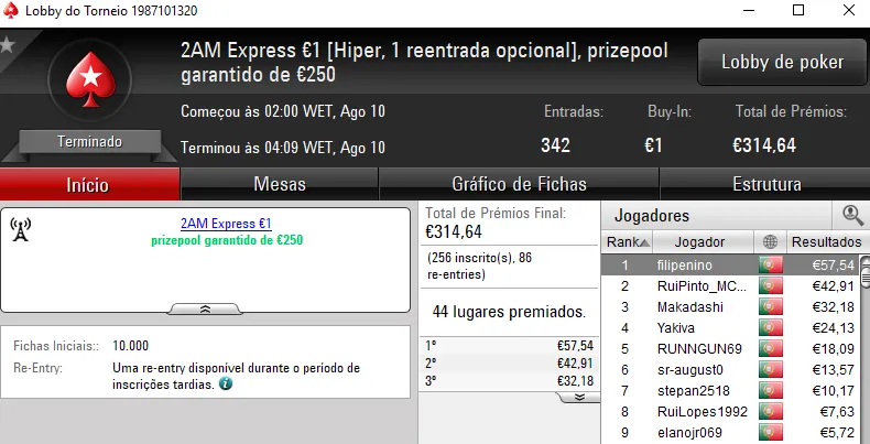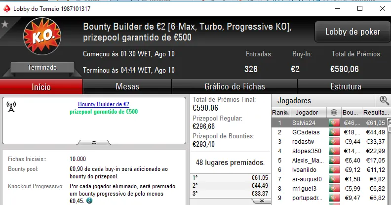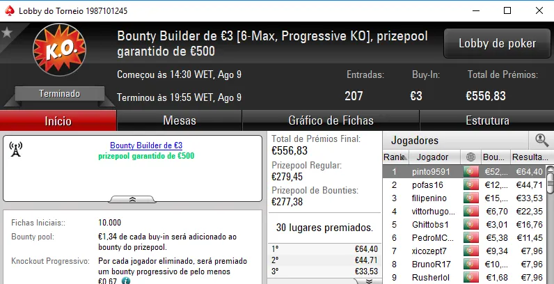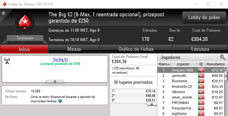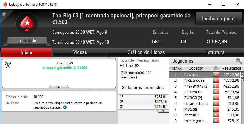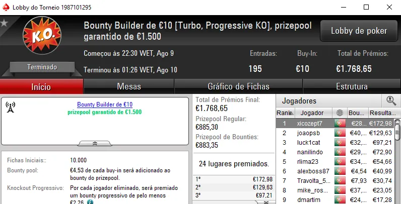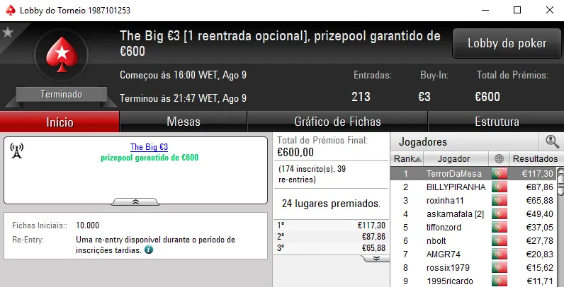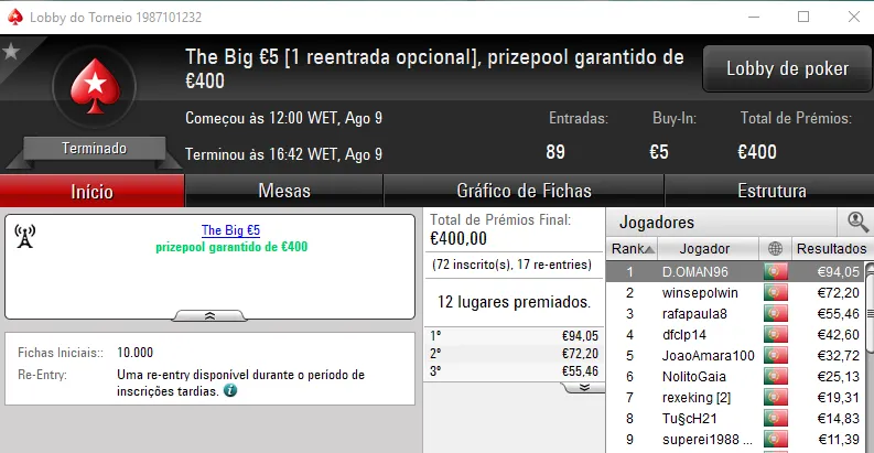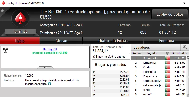 KeyserSozePT arrecadou o maior prémio da sessão e levou para casa €1,110. Na segunda posição El Flatador recebeu €750 e deu show ao juntar ainda um terceiro lugar no The Storm Rebuy €10 (€234) e a mesma posição no The Big €10 (€225). No total, El Flatador encaixou €1,209.