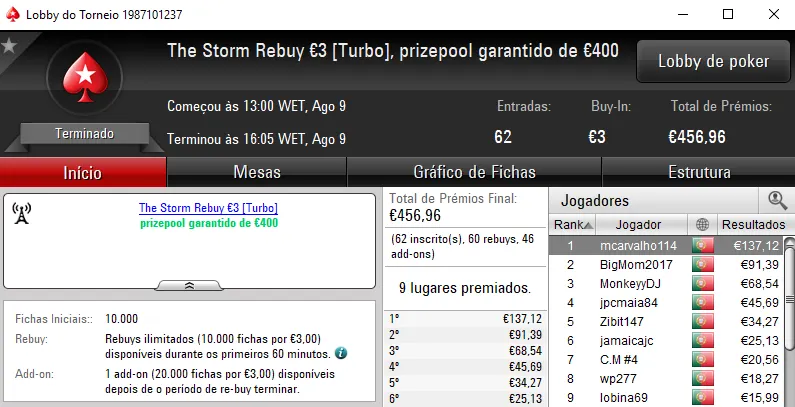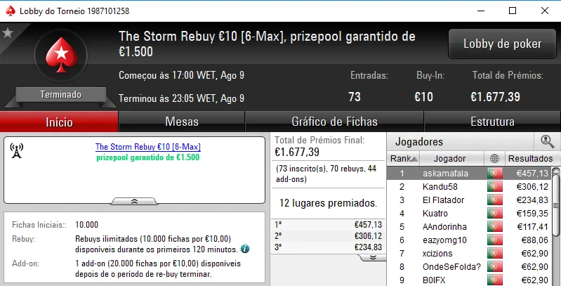 Este não foi o único prémio que askamafala recebeu. Ainda faturou €457 pela conquista do The Storm Rebuy €10 e €210 no The Storm Rebuy €5, perfazendo €1,539.