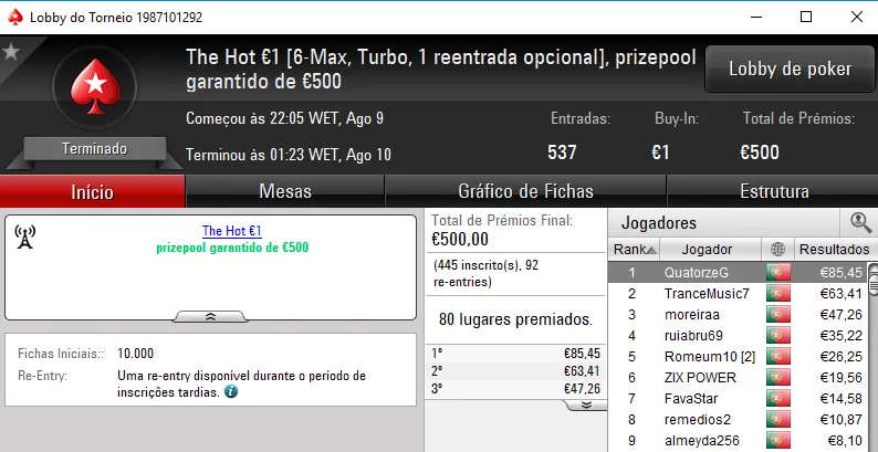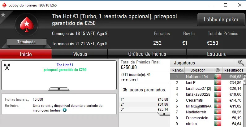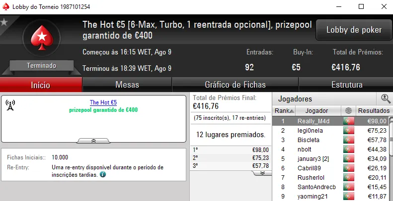 O The Hot BigStack Turbo €50 contou com 91 registos e o prizepool chegou aos €4,125. Não foi entregue nenhum prémio de 4 dígitos devido ao acordo realizado no heads-up entre puto59, que recebeu €922, e askamafala que levou €872. No terceiro posto, seabraking recebeu €536 de prémio.