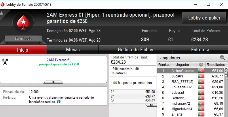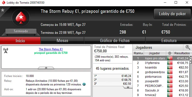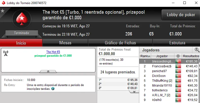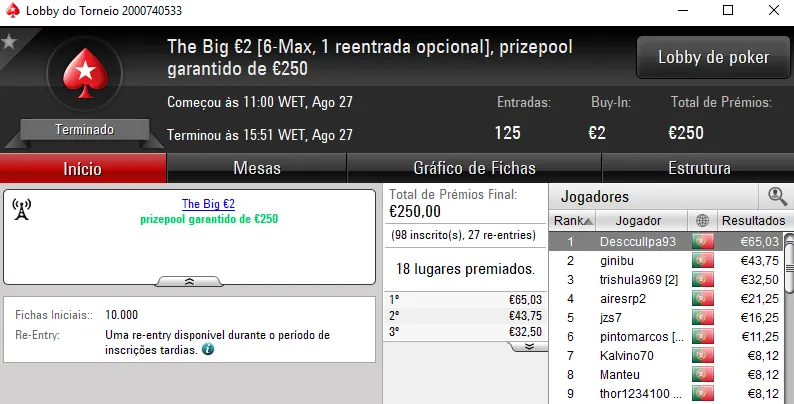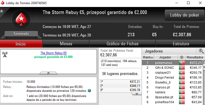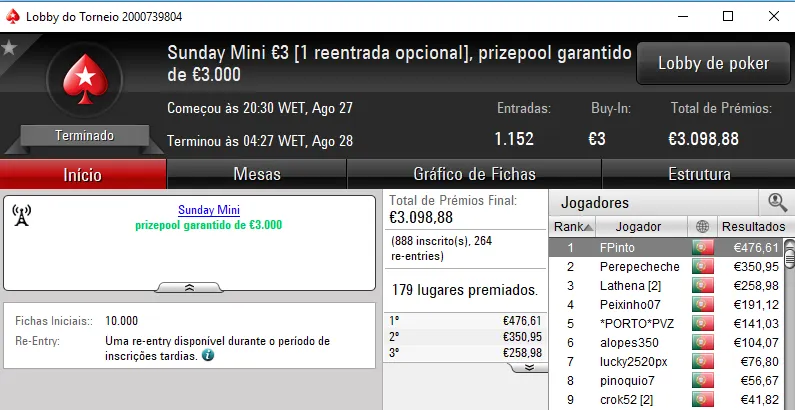 Mais um domingo recheado de ação na PokerStars.pt, onde 5 jogadores arrecadaram prémios de 4 dígitos.