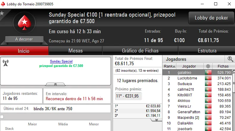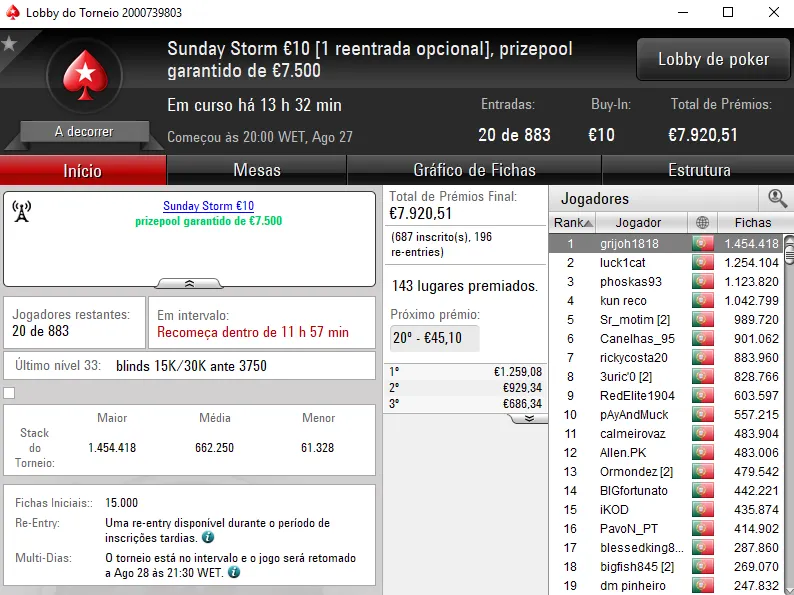 Hoje realiza-se o dia 2 do Sunday Special €100 e do Sunday Storm €10, em jogo estão mais de €16 mil.