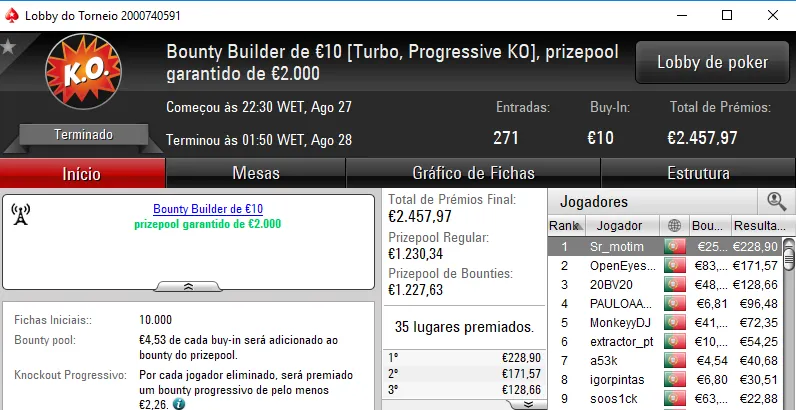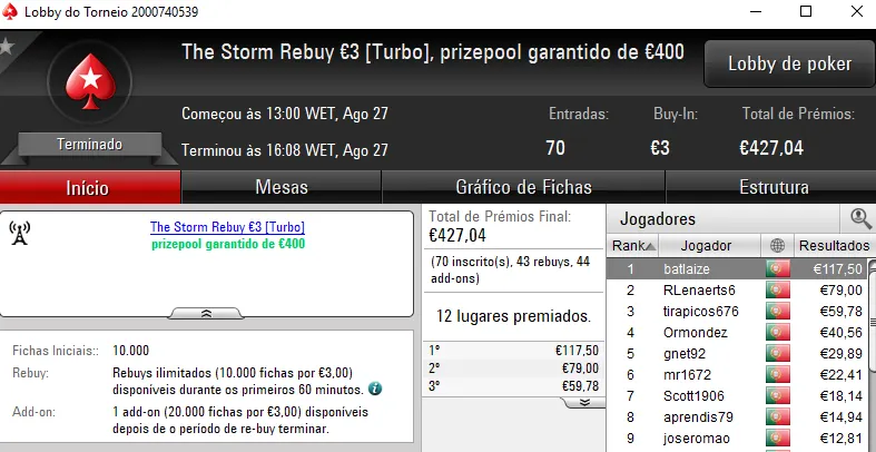 O Sunday Battle €30 também deu um prémio de 4 dígitos. O campeão marki450 arrecadou €531 de prémio e ainda somou €525 em bounties (€1,063). O torneio teve a participação de 202 jogadores, o que se traduziu em €5,437 de prize pool. No segundo posto, nunomartelo faturou €456. A terceira posição do pódio ficou para Mgc8998 que levou para casa €539.