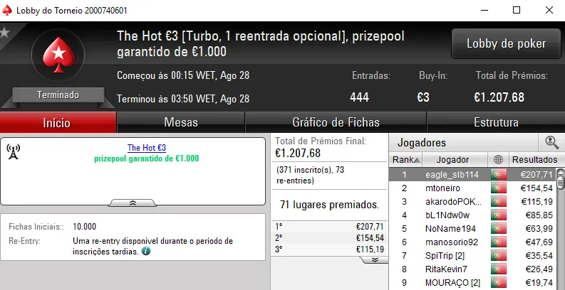 O maior desses prémios foi entregue no The Hot BigStack Turbo €50 onde participaram 115 jogadores que realizaram 24 reentradas. O prize pool foi de €6,300, com 24 jogadores a terem direito a prémio. O campeão foi rkka27 que levou para casa €1,512, depois de vencer xaneta7 no heads-up (€1,042), que ainda levou mais €974 pelo segundo lugar no Sunday Warm-up €50. O terceiro lugar ficou a cargo de $umoB€n que recebeu €787.