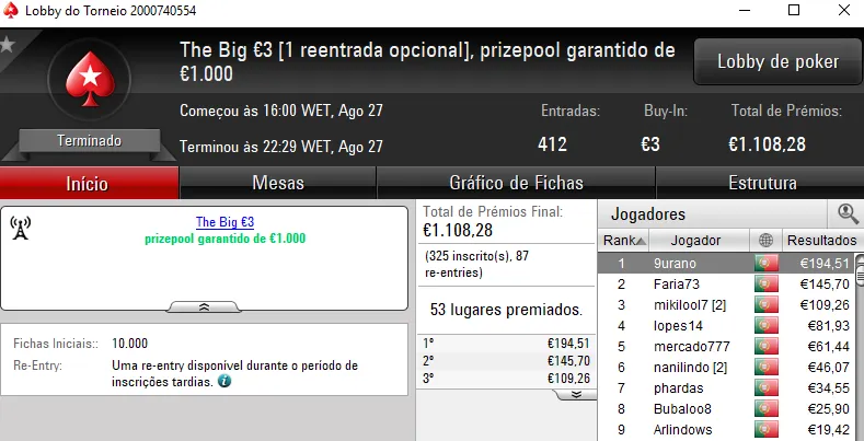 O Sunday Warm-Up €50 registou 139 entradas que fizeram o prize pool subir aos €6,235. Com o melhor prémio ficou starboy000 que faturou €1,293 após vencer xaneta7 no heads-up. A fechar o pódio, kNzZx amealhou €733.