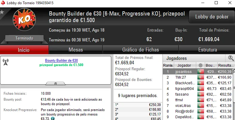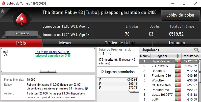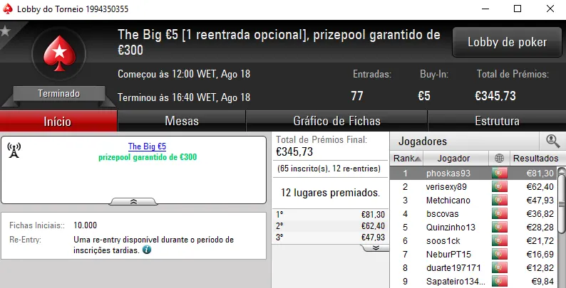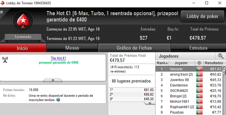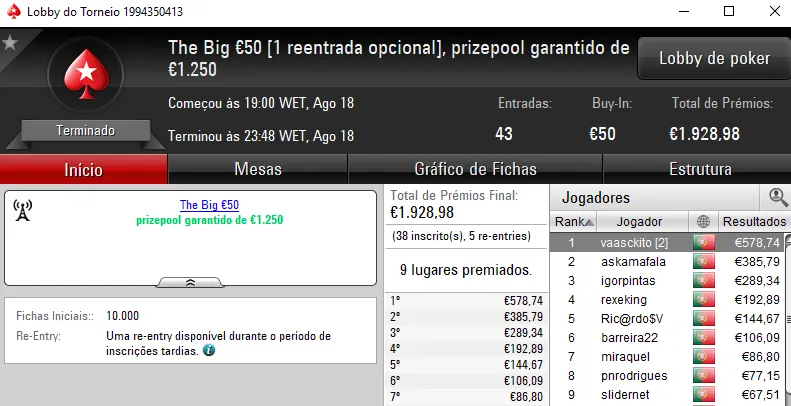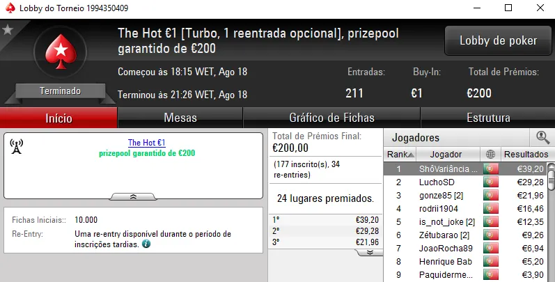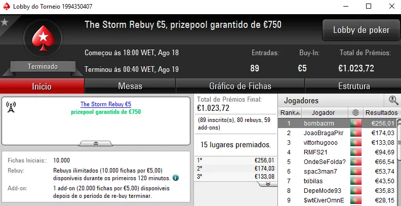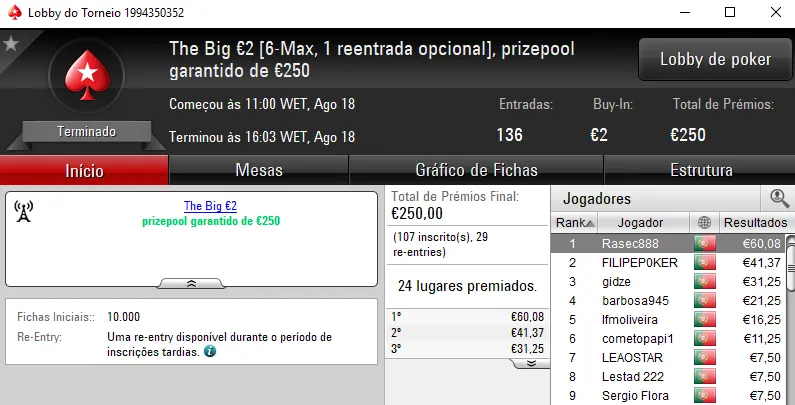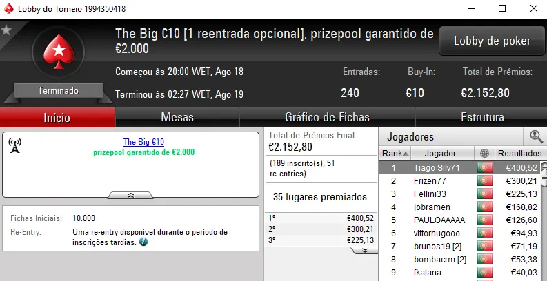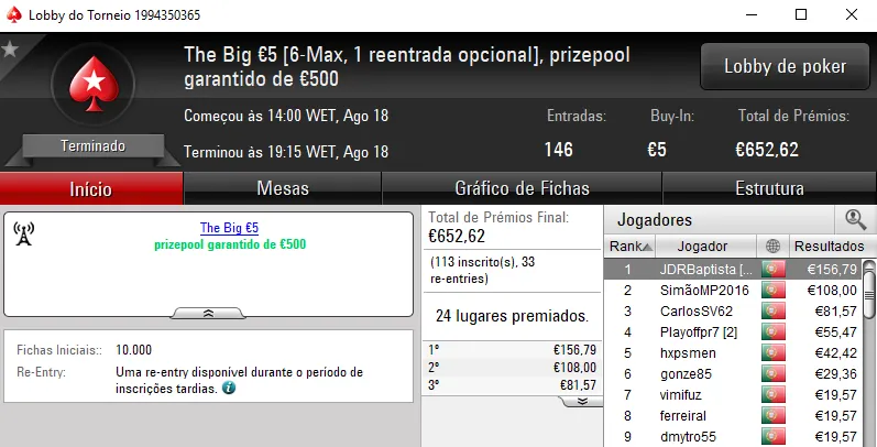 O The Big €100 contou com €2,719 fruto das 30 entradas registadas. Com a maior fatia do prize pool, rola23 levou para casa €1,006. TiJoao foi o jogador que perdeu no heads-up para receber €679. Na terceira posição, TMelo08 arrecadou €407.