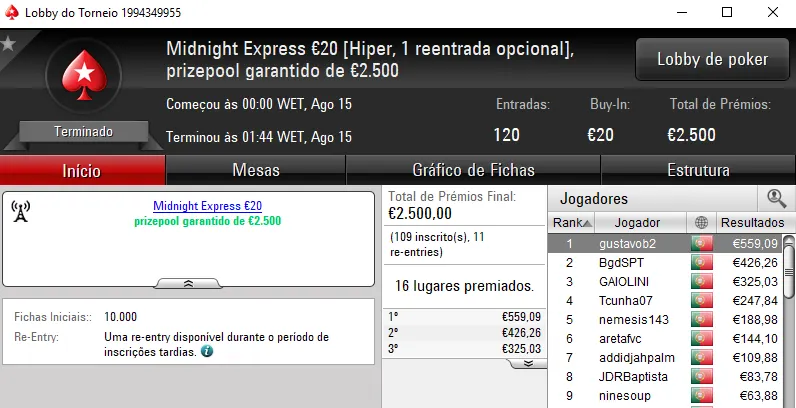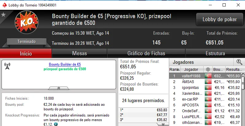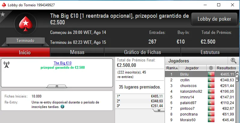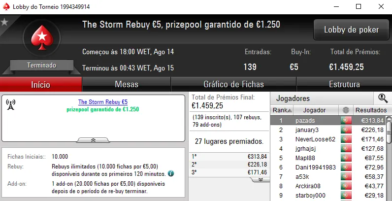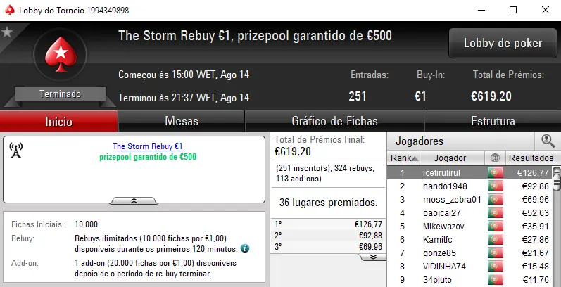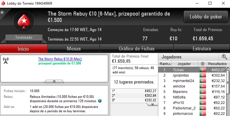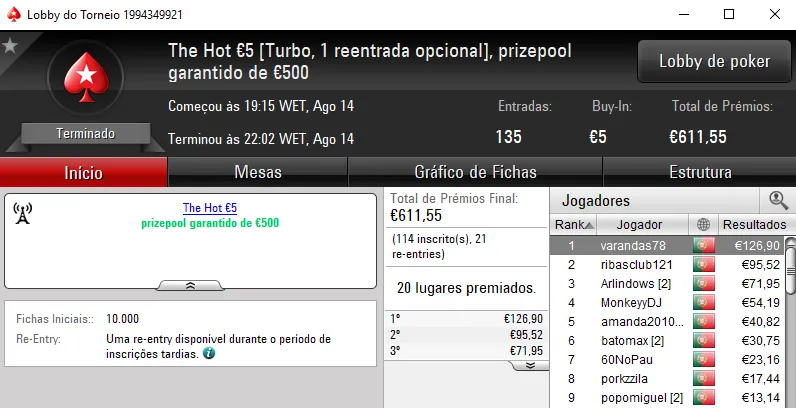 O The Hot BigStack Turbo €50 apresentou overlay e o prize pool garantido de €4,000 acabou por ser distribuído pelos 12 melhores classificados. No primeira posição, derleizao77 recebeu €1,090 de prémio, depois de vencer TMFS11 no heads-up (€730). A fechar o pódio, RubenBrek arrecadou €560.