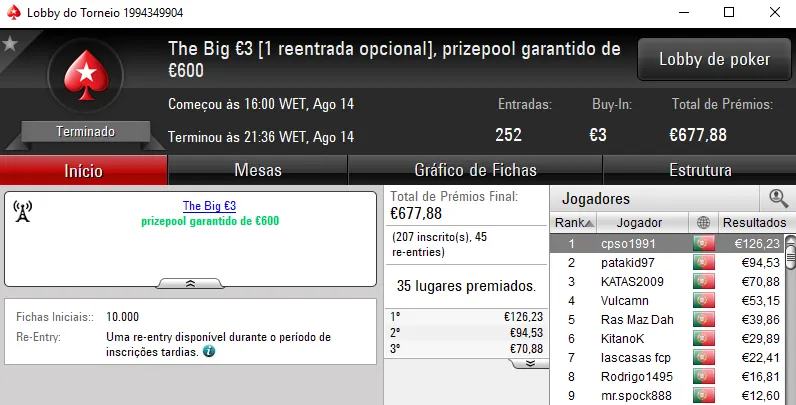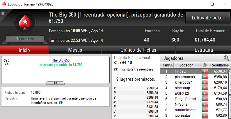 O maior prémio foi entregue no The Big €100 onde foram registadas 35 entradas e o prize pool chegou aos €3,172. O campeão foi seabraking que encaixou €1,173 de prémio pelo primeiro lugar. Na segunda posição, QuéFuerteTío recebeu €793, enquanto no terceiro posto, zenikem levou para casa €475.