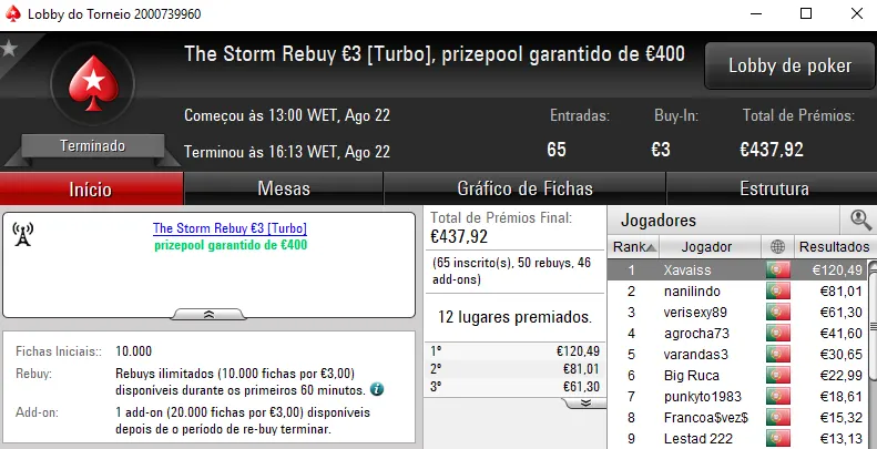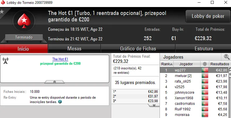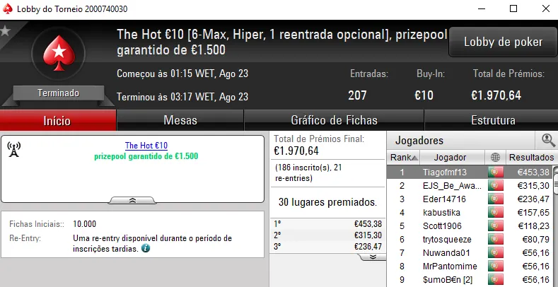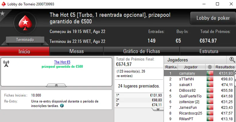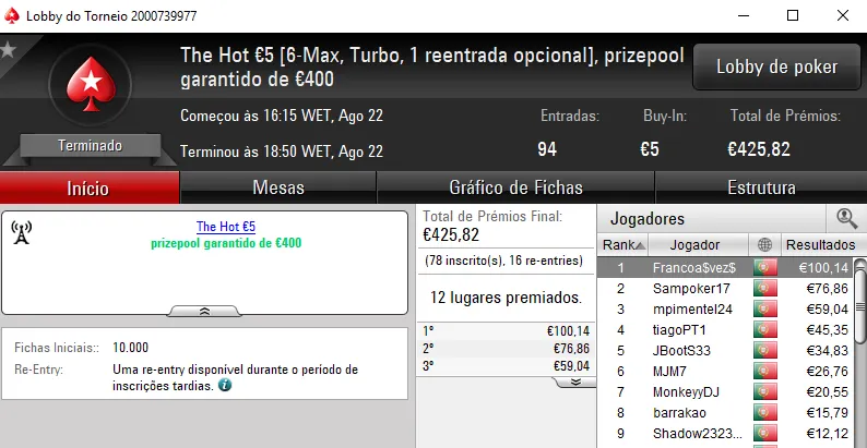 O terceiro maior prémio acabou por vir mesmo no The Hot BigStack Turbo €50 que contou com 102 entradas e €4,623 de prize pool. NMaiaCC foi o campeão e arrecadou €1,202. O segundo lugar pertenceu, tal como dissemos, a El Flatador e na terceira posição, jmsdinis10 recebeu €601.