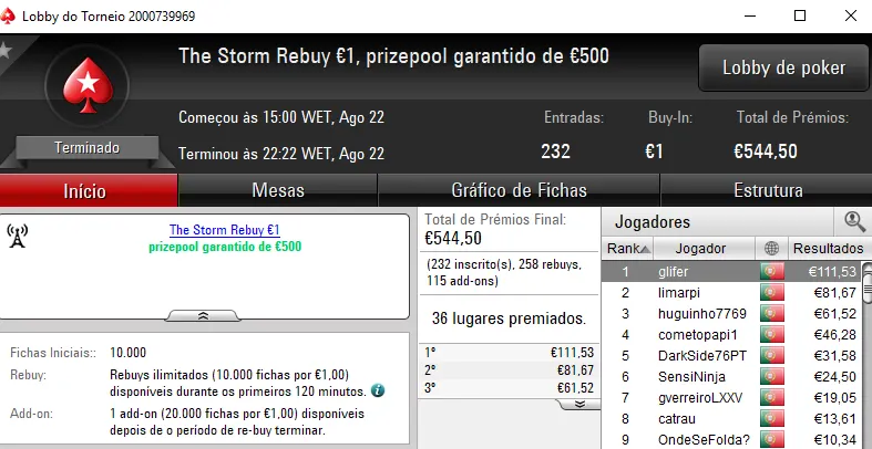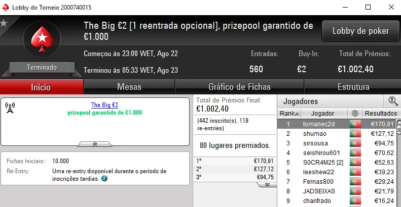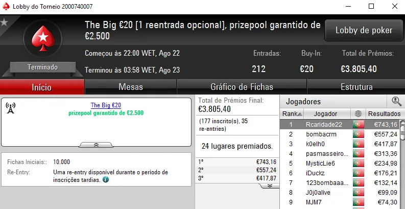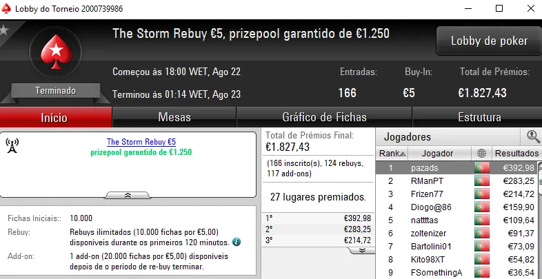 Menção honrosa para pasmasseiro que chegou aos €1,002 em três torneios. Foi quinto no Super Tuesday Warm-Up €50 para €389, o quarto lugar no The Big €20 valeu mais €313 e a quinta posição no The Hot BigStack Turbo €50 ainda rendeu €300.