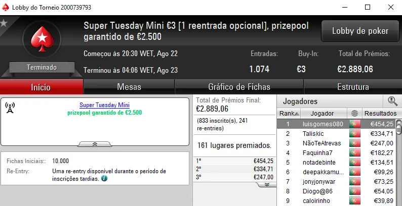 Vieira.Lr foi o grande vencedor do dia ao conquistar a Super Tuesday €100, onde foram registadas 79 entradas que perfizeram o prize pool de €7,161. Pelo triunfo, levou para casa €1,682 aos quais ainda somou €226 pelo sétimo lugar no Super Tuesday Warm-Up €50 (€1,908).