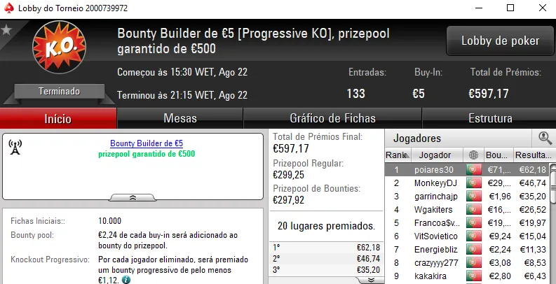 No segundo posto, kakiers levou para casa €879 e ainda acrescentou €495 pela vitória no Bounty Builder €10, €139 pelo sétimo lugar no Super Tuesday Midnight Express €20 e €113 no Super Tuesday Big €10. Tudo somado e kakiers levou para casa €1,626.