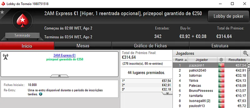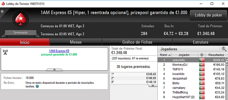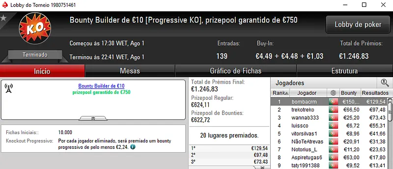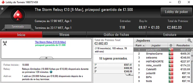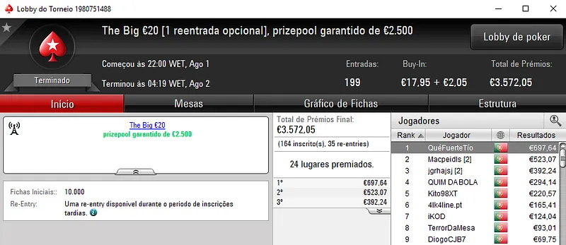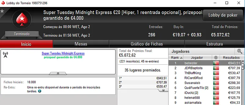 O Super Tuesday €100 foi a estrela da companhia onde os três jogadores do pódio receberam prémios acima do milhar de euros. O campeão fmbdrking embolsou €2,045 depois de se sobrepor ao field com 96 registos e €8,702 de prize pool. SlbSpade foi o jogador que perdeu o heads-up, mas que mesmo assim levou para casa €1,570. No terceiro posto, KeyzerSozePT arrecadou €1,206, aos quais juntou ainda €196 pelo terceiro lugar no Bounty Builder €10.