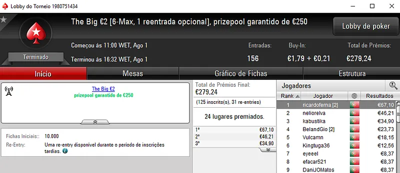 O The Hot BigStack Turbo €50 registou 135 entradas e juanchito007 foi quem levou a maior fatia do prize pool de €6,119. Pelo triunfo recebeu €1,468. 4lk4line.pt terminou no segundo posto e amealhou €1,012, aos quais ainda juntou um segundo lugar no Super Tuesday Battle €30 para €575 (€1,587 no total). O último lugar do pódio ficou para erdnaandre que arrecadou €764.