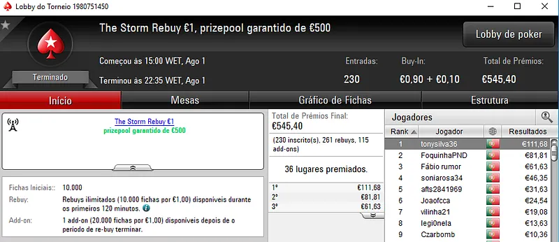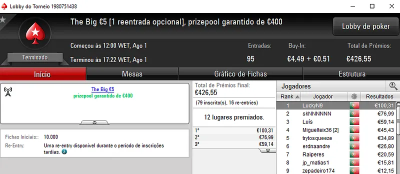 €1,283 foi o prémio que Ferreira SnG levou para casa pelo primeiro lugar no Super Tuesday Battle €30, com 213 entradas. A segunda posição ficou para 4lk4line.pt (€575), enquanto nounoursë encaixou €507.