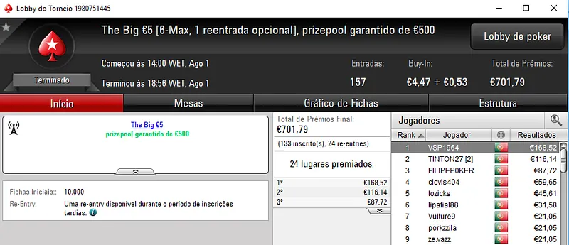 O Super Tuesday Big €10 acolheu 689 entradas e o campeão foi h.daniel940 que faturou €1,012 de prémio. O prize pool do torneio chegou aos €6,180 e para GengisKan-36 ficaram reservados €751. Já tfmvl recebeu €558 na terceira posição.