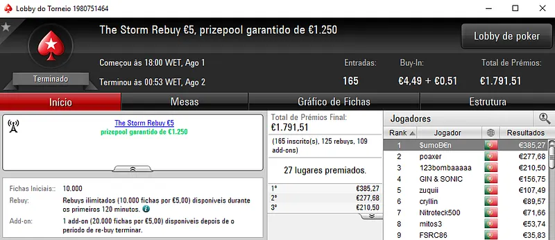 FilipeLF foi o campeão do Super Tuesday Warm-Up €50 com 123 registos e faturou €1,233. Em segundo lugar, $umoB€n levou €940 para somar aos €385 pela vitória no The Storm Rebuy €5. O bronze ficou para galatrixo que recebeu €717.