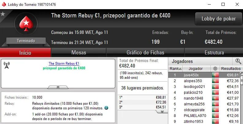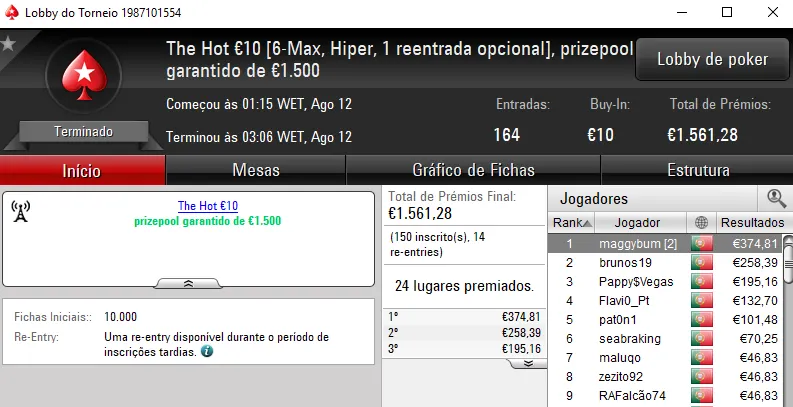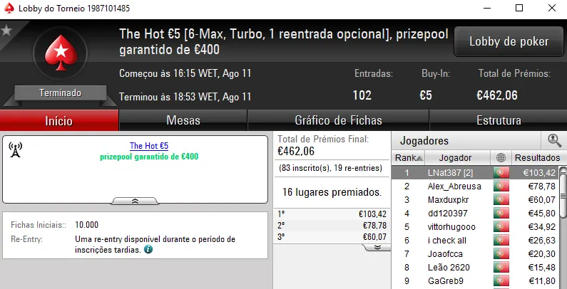 PC1904 terminou o The Hot BigStack Turbo €50 na segunda posição e recebeu €595, enquanto ZURC9 levou para casa €456 pelo terceiro lugar.