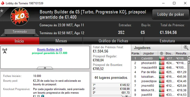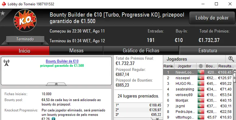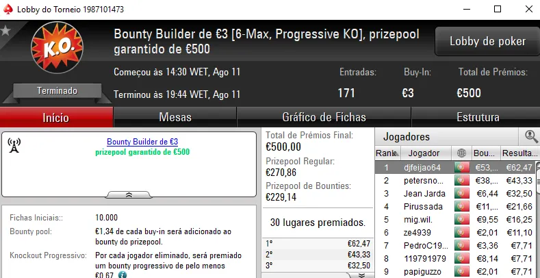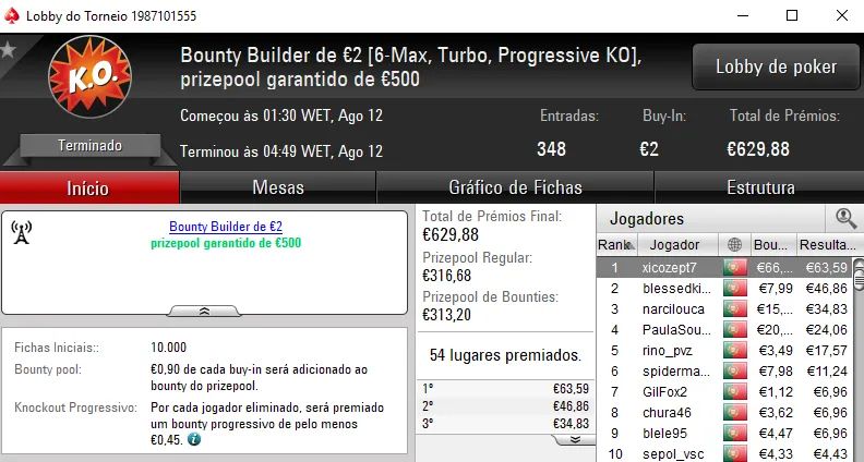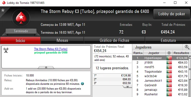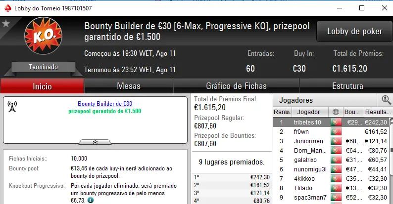 O The Hot BigStack Turbo €50 contou com 72 entradas, onde o prize pool acumulado chegou aos €2,500. No primeiro lugar, tribetes 10 arrecadou €889 e ainda juntou mais €380 pela terceira posição no The Big €100 e €541 pela vitória no Bounty Builder €30. No total, tribetes 10 faturou €1,810 nestes três torneios.