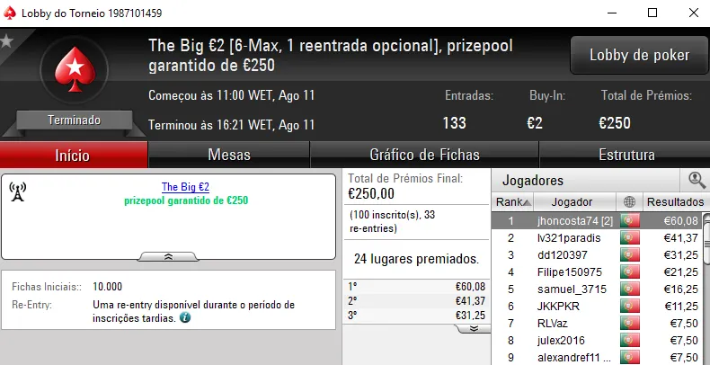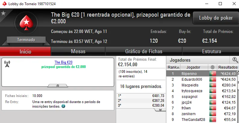 O grande vencedor do The Big €100 foi TMelo08 que embolsou €939 de prémio. O torneio contou com 28 entradas e o prize pool foi distribuído pelos 6 melhores jogadores. Vitor451 terminou em segundo e arrecadou €634 de prémio.