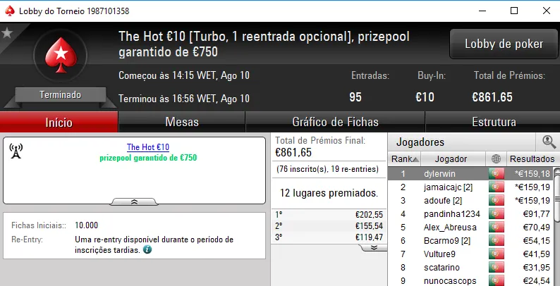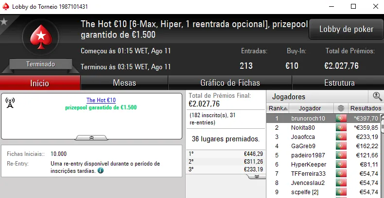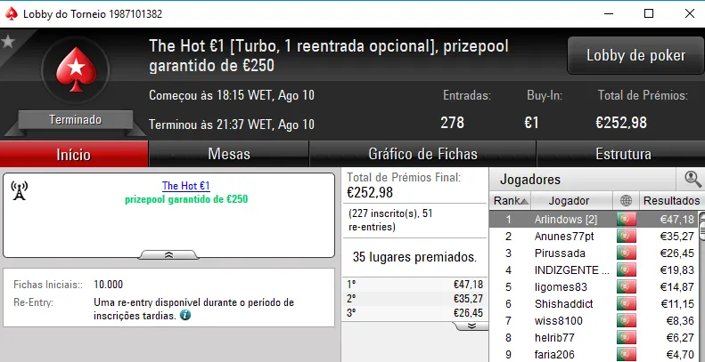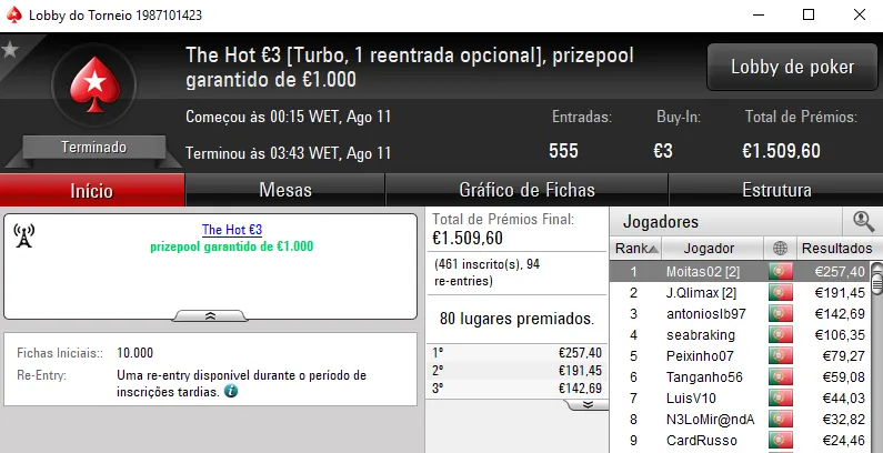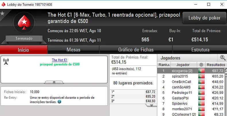 O grande vencedor da noite foi xaneta7 que recebeu €1,214 depois de vencer o The Hot BigStack Turbo €50 com 103 entradas e €4,668 de prizepool. O segundo posto ficou reservado a pat0n1 que levou €817, enquanto na terceira posição, paulo349 recebeu €606.