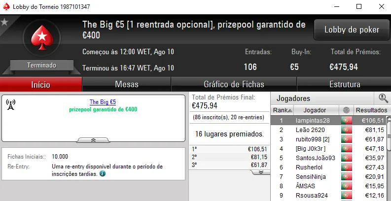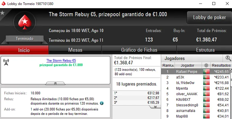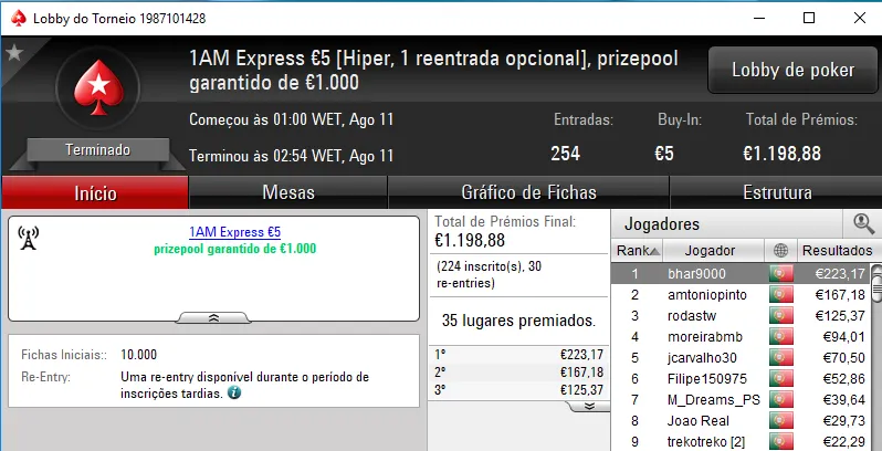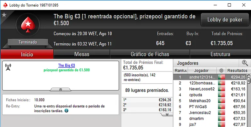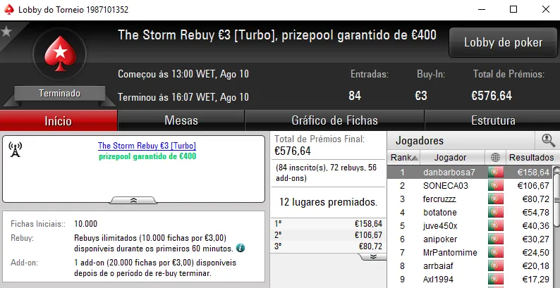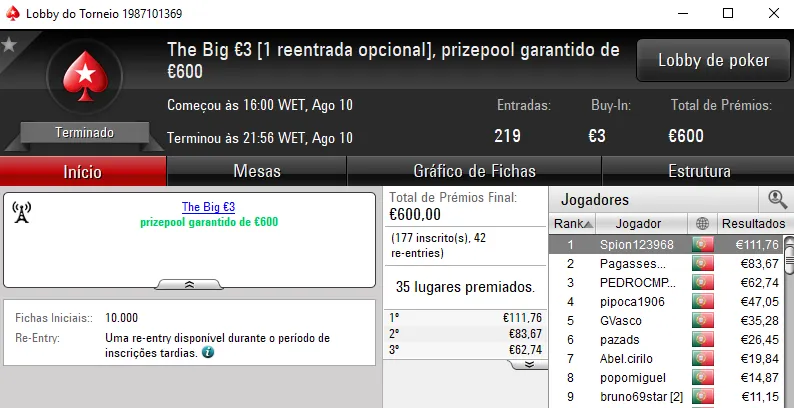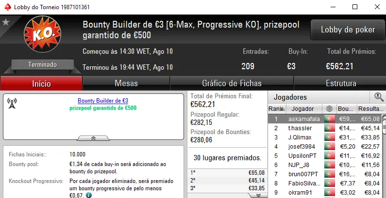 Destaque ainda para NãoTeAtrevas que faturou €573 pela vitória no Bounty Builder €20 e €433 pelo segundo lugar no The Big €20. No total, NãoTeAtrevas levou para casa €1,006 nestes dois torneios.