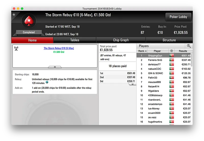 tribetes10 foi o grande vencedor do Sunday Storm e meteu ao bolso €1.558. Foram 1.131 os jogadores registados no torneio e, ao segundo dia, tribetes10 bateu Faraó 1948 heads-up e recebeu a medalha de ouro.