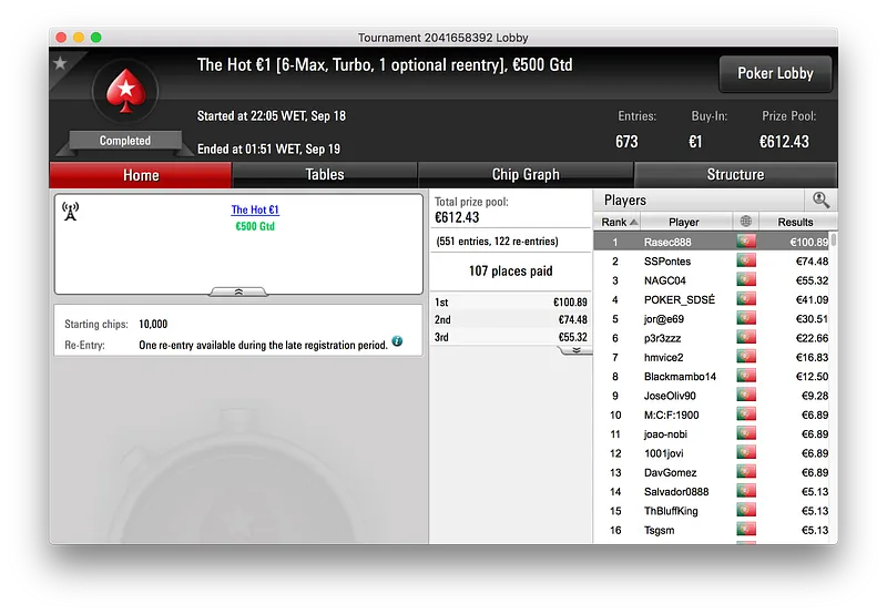 O vencedor do Hot BigStack Turbo €50 levou a melhor sobre 105 oponentes e ganhou €1.249. As 106 entradas perfizeram um prize pool de €4.804 e, no topo dos 18 pagos, ficou 123bombaaaaa que venceu o torneio depois de derrotar flucas672 (2º - €840) na batalha final.
