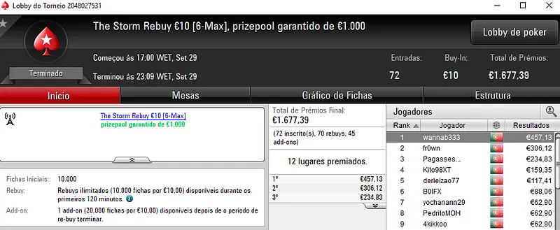 Já o The Big €100 acolheu 36 entradas e com o maior prémio do dia, francos1334 amealhou €1,207 de prémio. O segundo posto rendeu €815 a PT1972. A fechar o pódio, DrTooth recebeu €489 pela medalha de bronze.