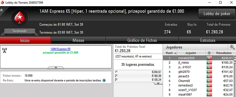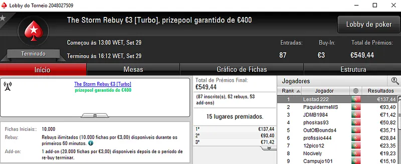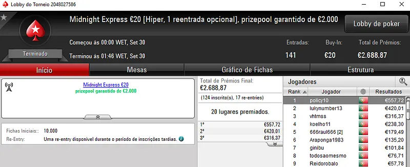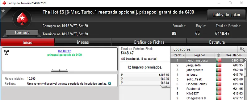 O The Hot BigStack Turbo €50 contou com 106 entradas que perfizeram um prize pool de €4,804, onde 18 jogadores saíram com prémios. Na primeira posição, derleizao77 faturou o maior prémio da sessão, cerca de €1,249 de prémio. Em segundo lugar, otup sajief levou para casa €840, enquanto policy10 encaixou €624 de prémio.