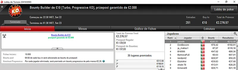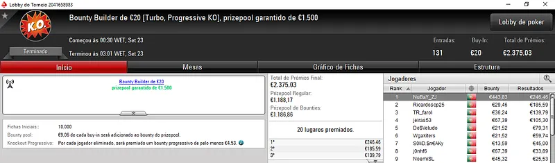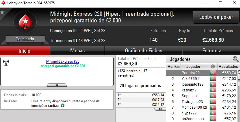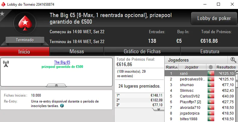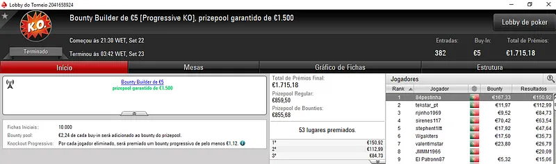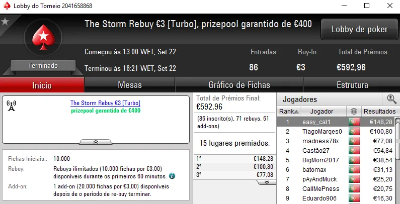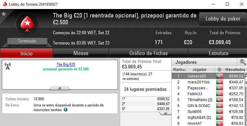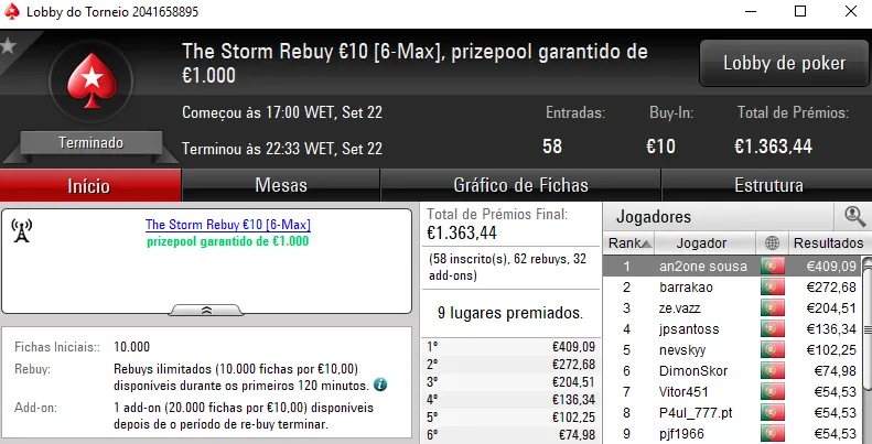 O heads-up foi disputado contra B0IFX que encaixou €815 pelo segundo lugar, enquanto AAEUKK recebeu €489 na terceira posição.