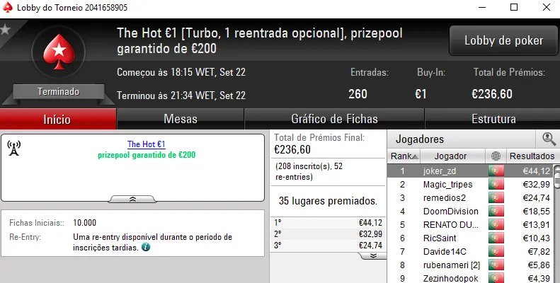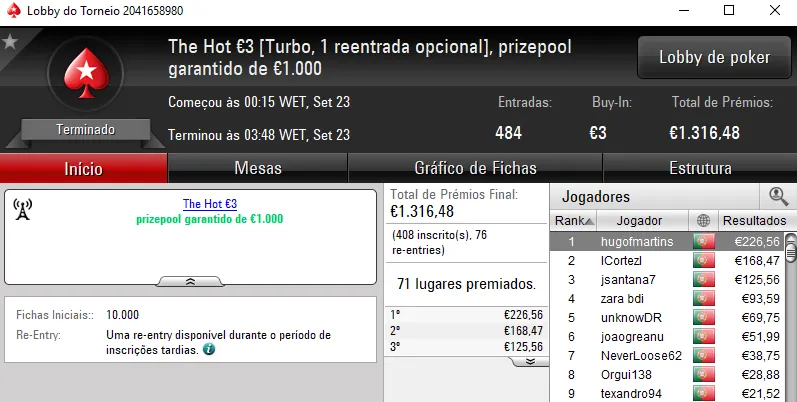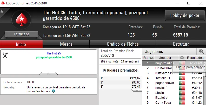 O The Hot BigStack Turbo €50 registou 95 entradas que perfizeram um prize pool de €4,306. O campeão foi simba2015188 que recebeu o único prémio de 4 dígitos entregue neste torneio, cerca de €1,119. Vacane faturou €753 pelo segundo lugar. A fechar o pódio, Fellini33 levou para casa €559.