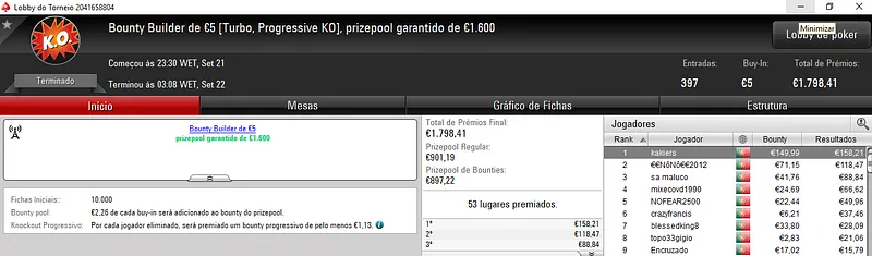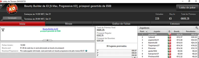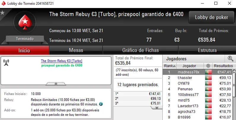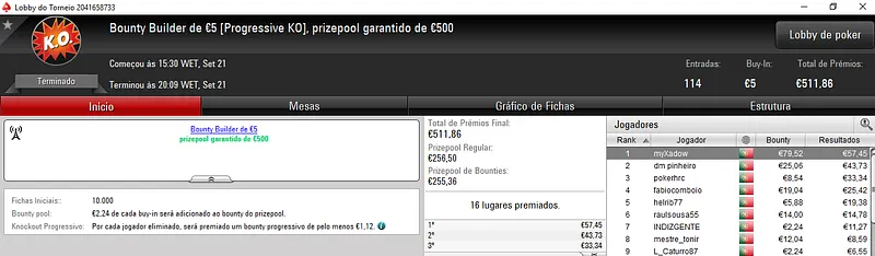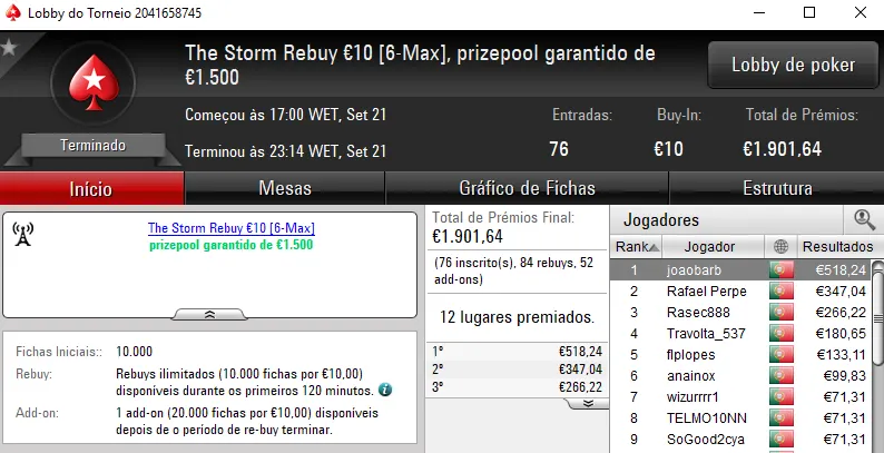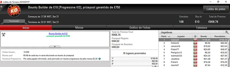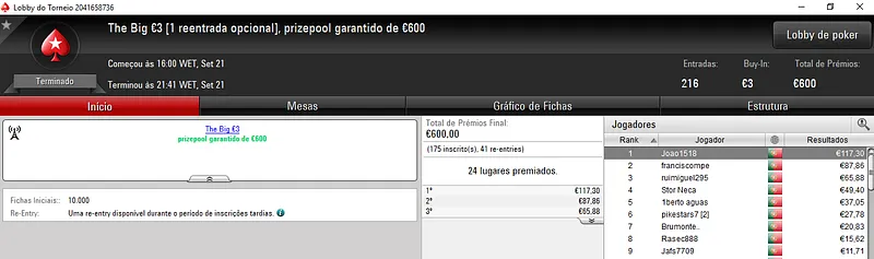 O The Big €100 contou com 49 entradas e €4,441 de prize pool. No topo da classificação, galatrixo recebeu €1,332 de prémio. RicBG arrecadou €888 na segunda posição, enquanto B0IFX faturou €666 no terceiro lugar.
