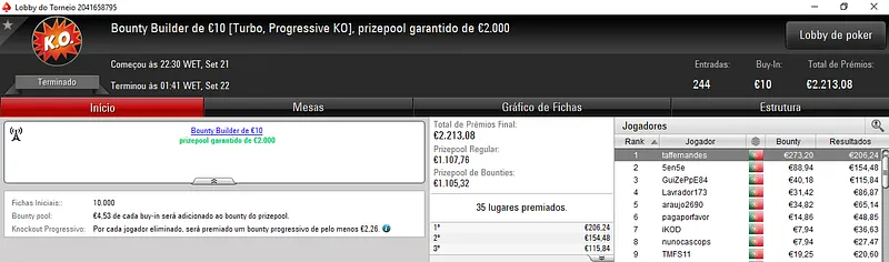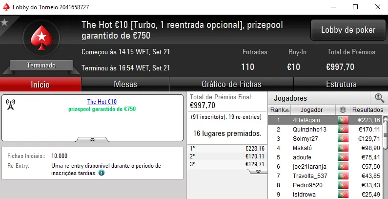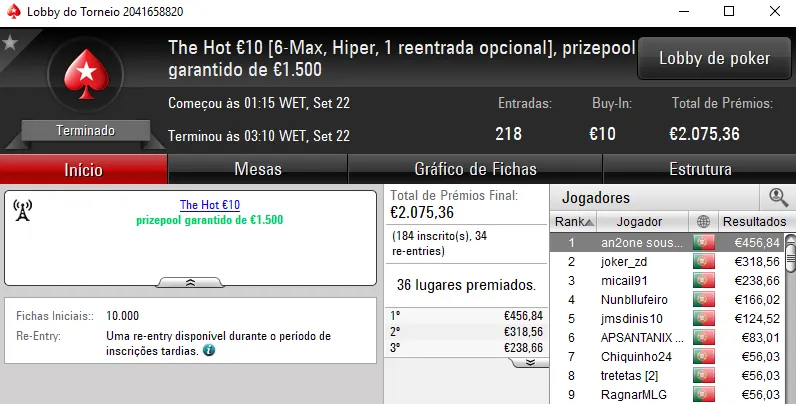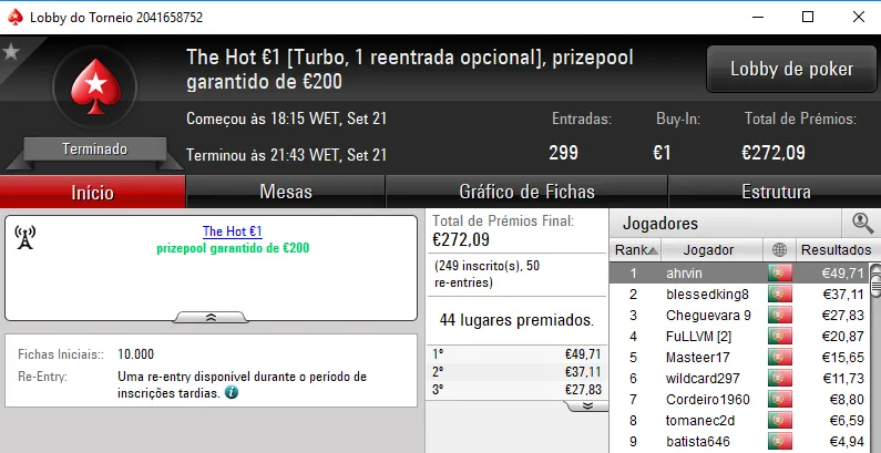 O maior prémio foi parar à conta de jmsdinis10 que venceu o The Hot BigStack Turbo €50. Este torneio contou com 127 entradas e o prize pool acumulado chegou aos €5,756. Pelo título, jmsdinis10 arrecadou €1,381, depois de vencer kakiers no heads-up (€952). Na terceira posição do pódio, wannab333 arrecadou €719.